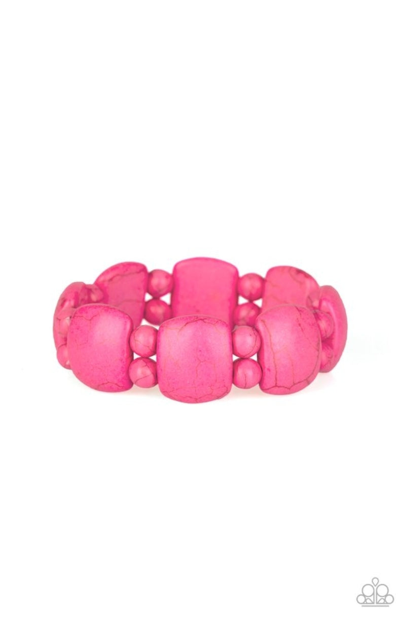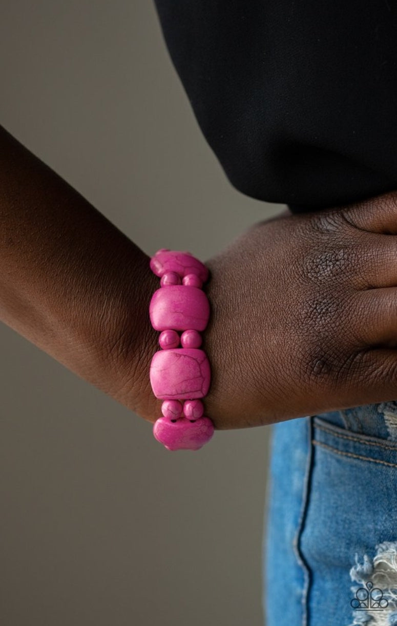 A collection of round and square-like pink stones are threaded along stretchy bands around the wrist for a seasonal look.