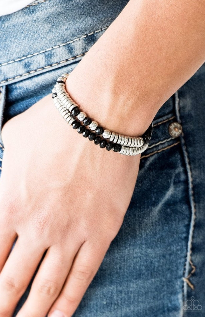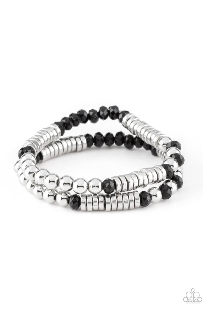 Classic silver beads, faceted black crystal-like beads, and dainty silver discs are threaded along stretchy bands, creating shimmery layers across the wrist.