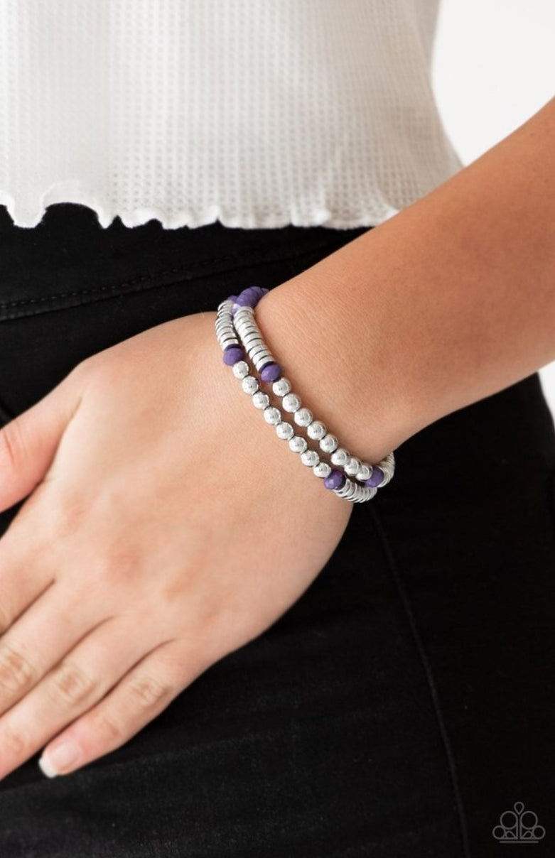 Classic silver beads, faceted purple beads, and dainty silver discs are threaded along stretchy bands, creating shimmery layers across the wrist.