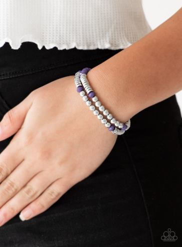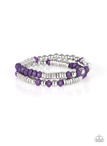 Classic silver beads, faceted purple beads, and dainty silver discs are threaded along stretchy bands, creating shimmery layers across the wrist.