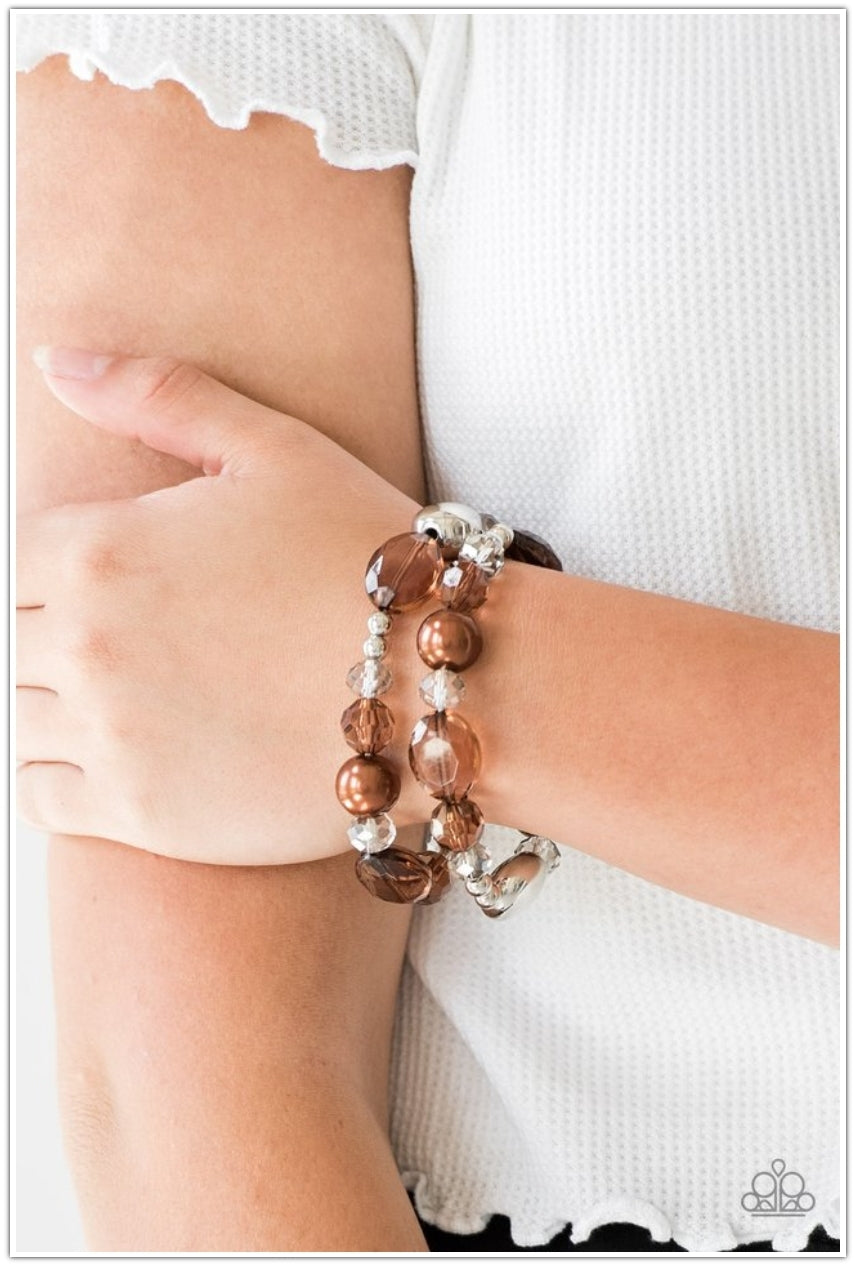 An array of brown pearls, shiny silver beads, and brown crystal-like beads are threaded along stretchy bands around the wrist for a refined look.