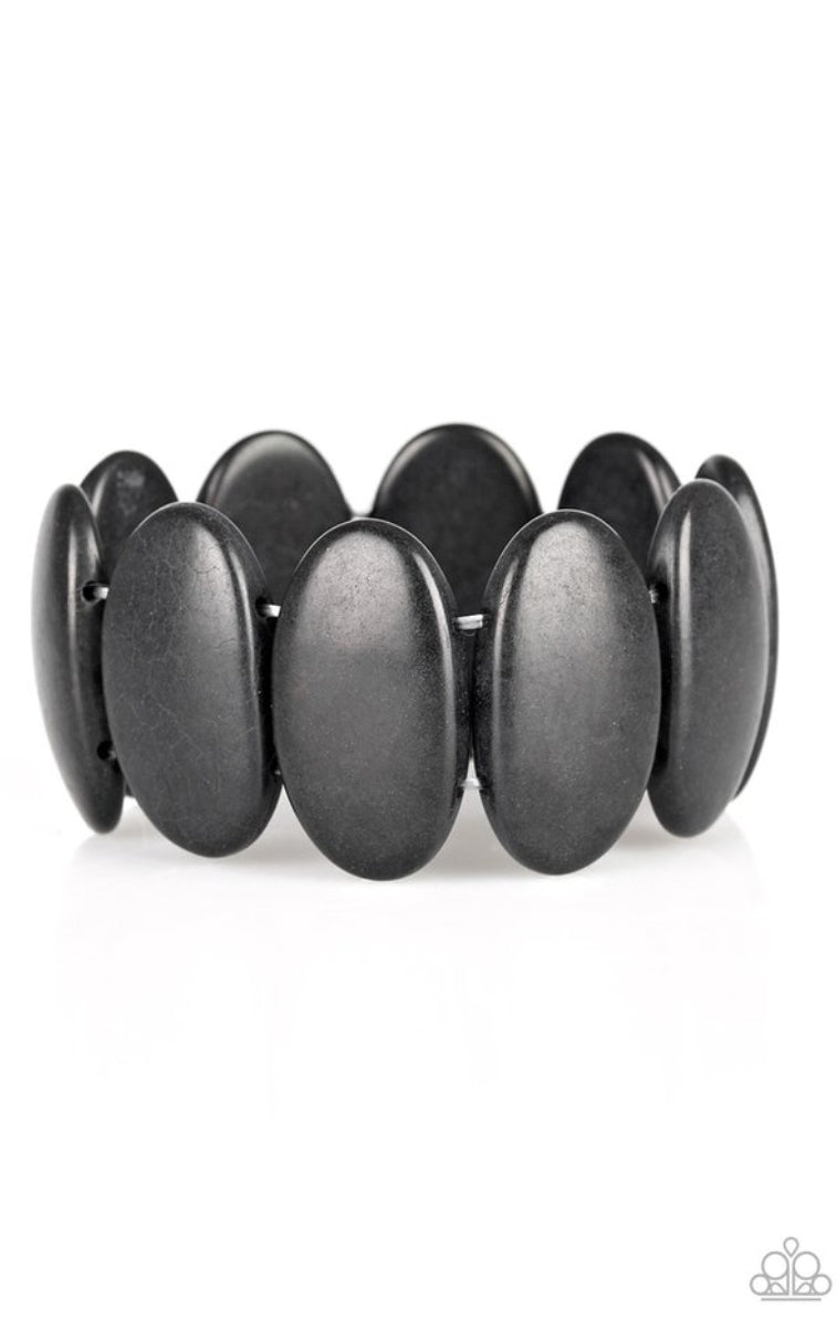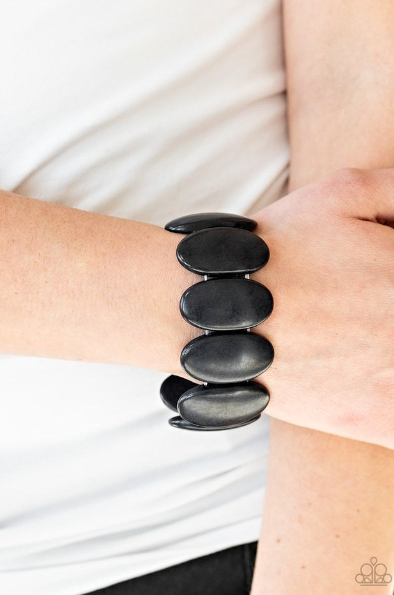 Chiseled into smooth ovals, earthy black stones are threaded along stretchy elastic bands around the wrist for an artisan inspired look.