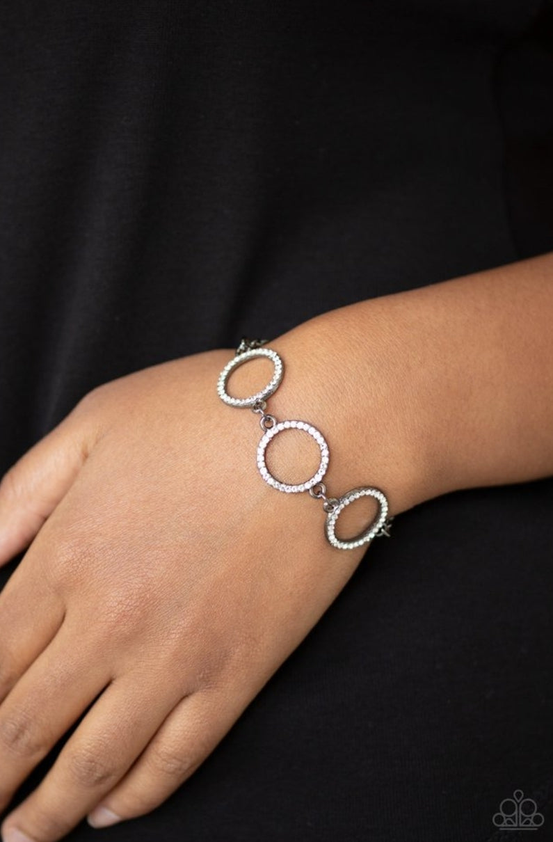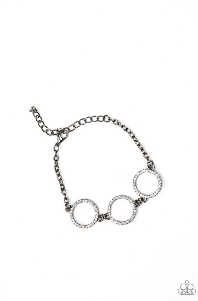 Encrusted in glassy white rhinestones, three glittery gunmetal rings link across the wrist for a glamorous look. Features an adjustable clasp closure.