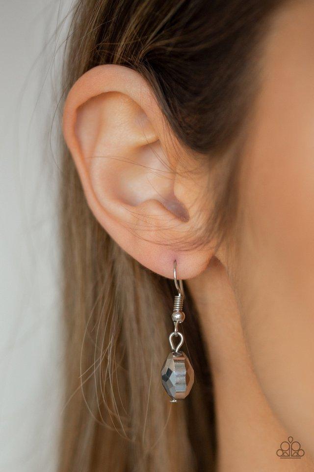 A collection of hematite rhinestone gems and abstract silver rings trickle along a classic silver chain across the chest for a refined flair. Features an adjustable clasp closure. Sold as one individual necklace. Includes one pair of matching.