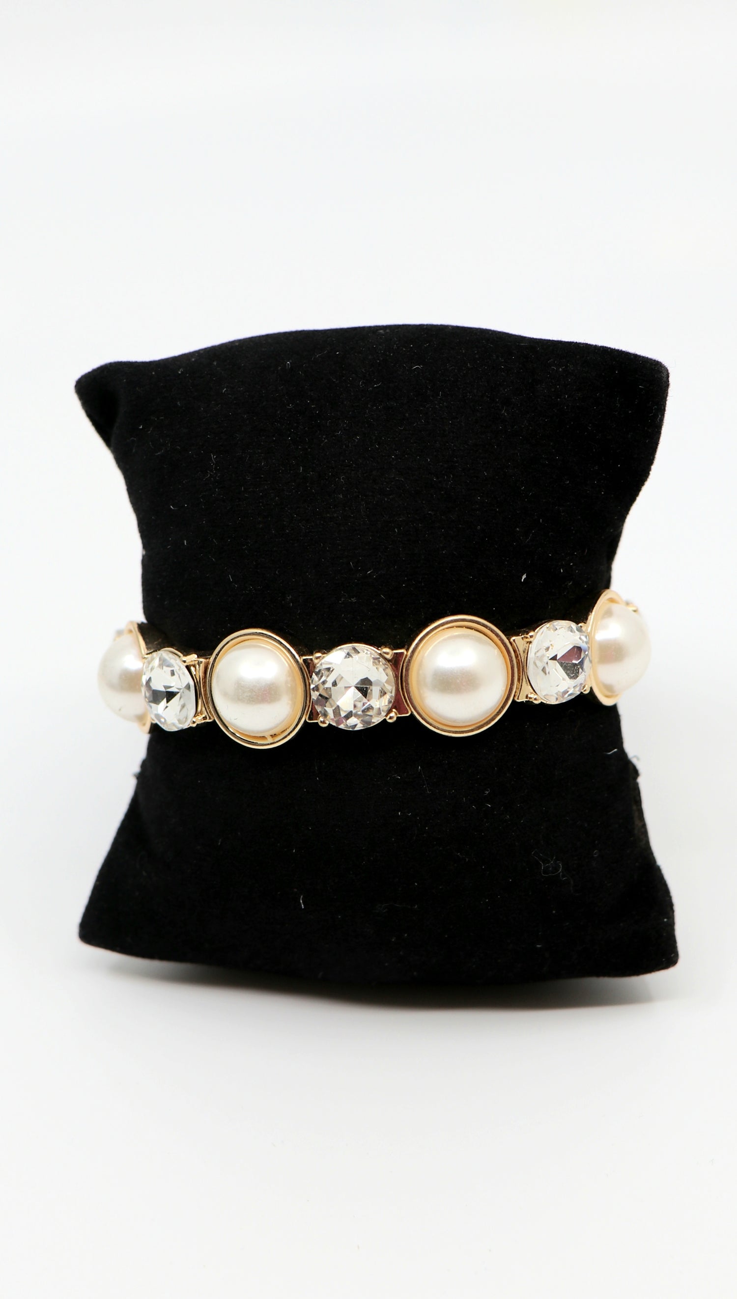 Featuring sleek gold fittings, bubbly white pearls and oversized white rhinestones are delicately threaded along stretchy bands around the wrist for a refined flair.