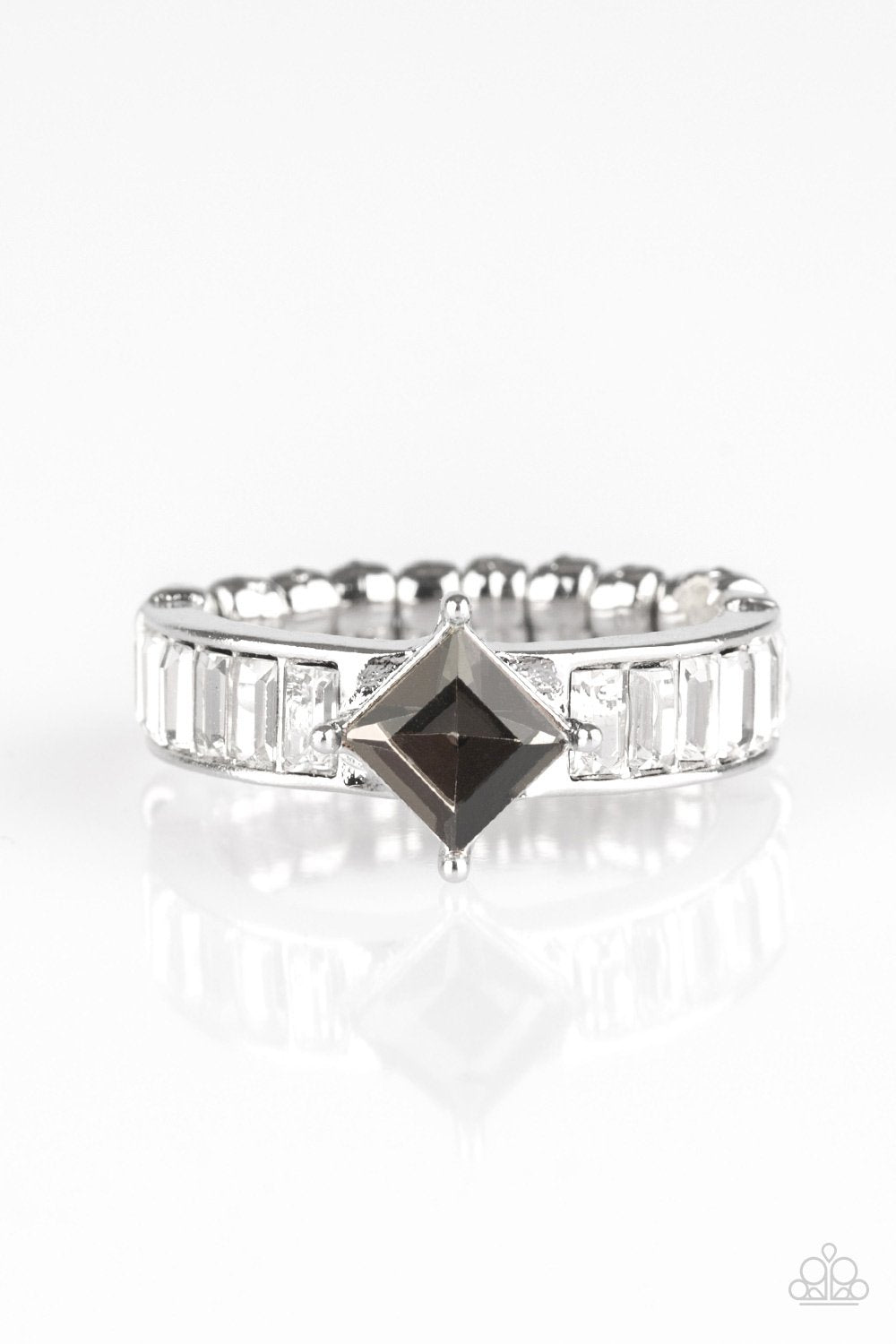 Featuring elegant emerald style cuts, glassy white rhinestones are pressed into a sleek silver band. A smoky rhinestone is pressed into the center of the glittery band, creating a glamorous centerpiece atop the finger. Features a dainty stretchy band for a flexible fit.