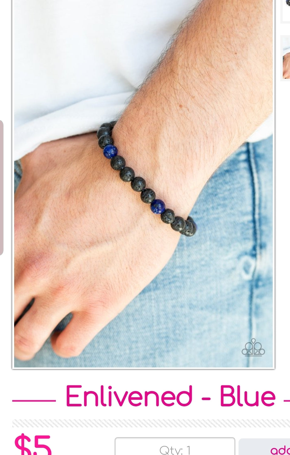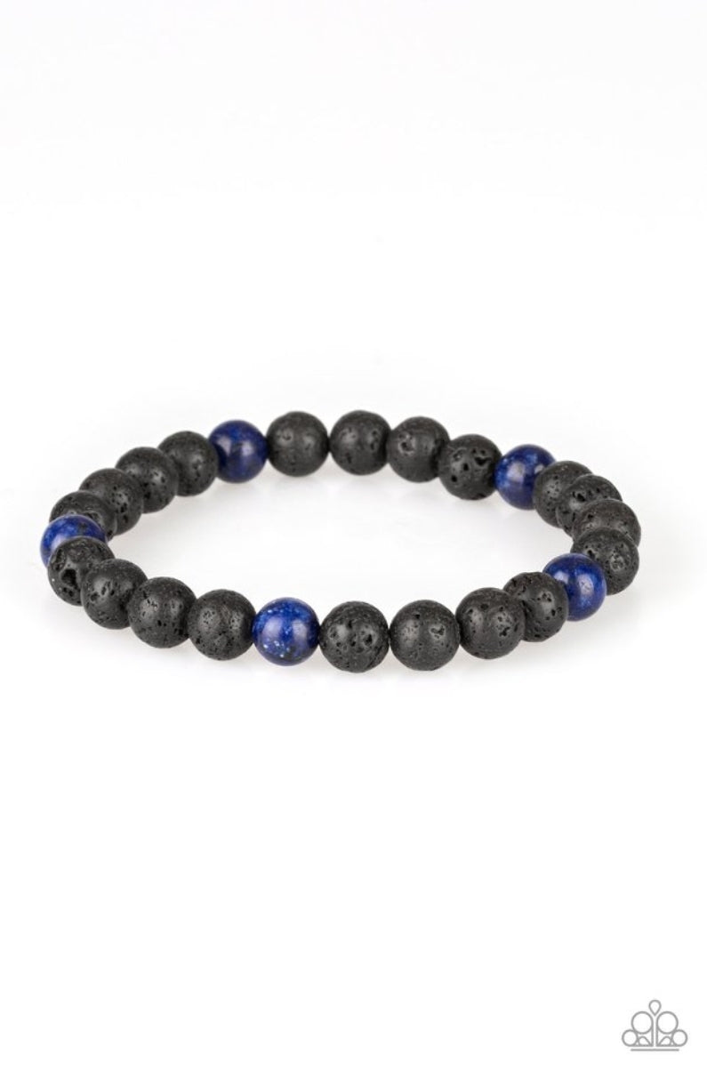 An earthy collection of black lava stones and glassy blue stones are threaded along a stretchy band around the wrist for a seasonal look.