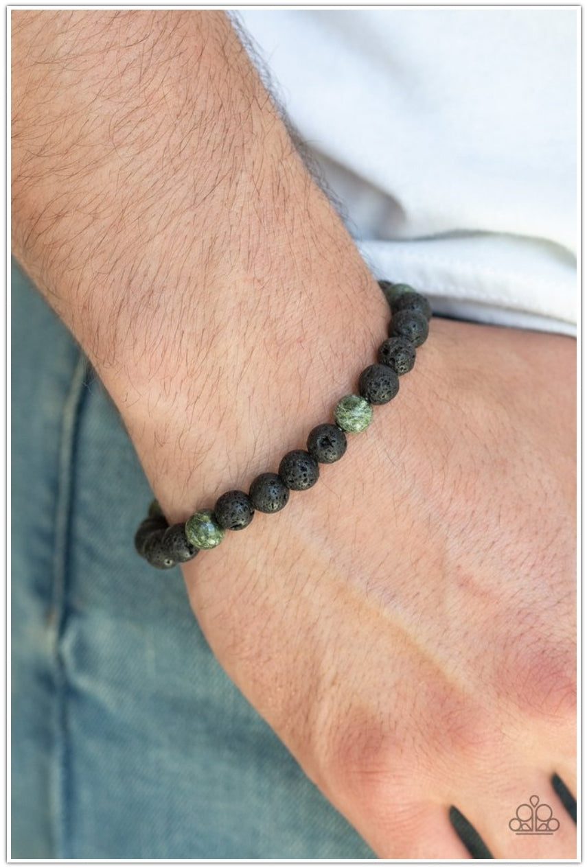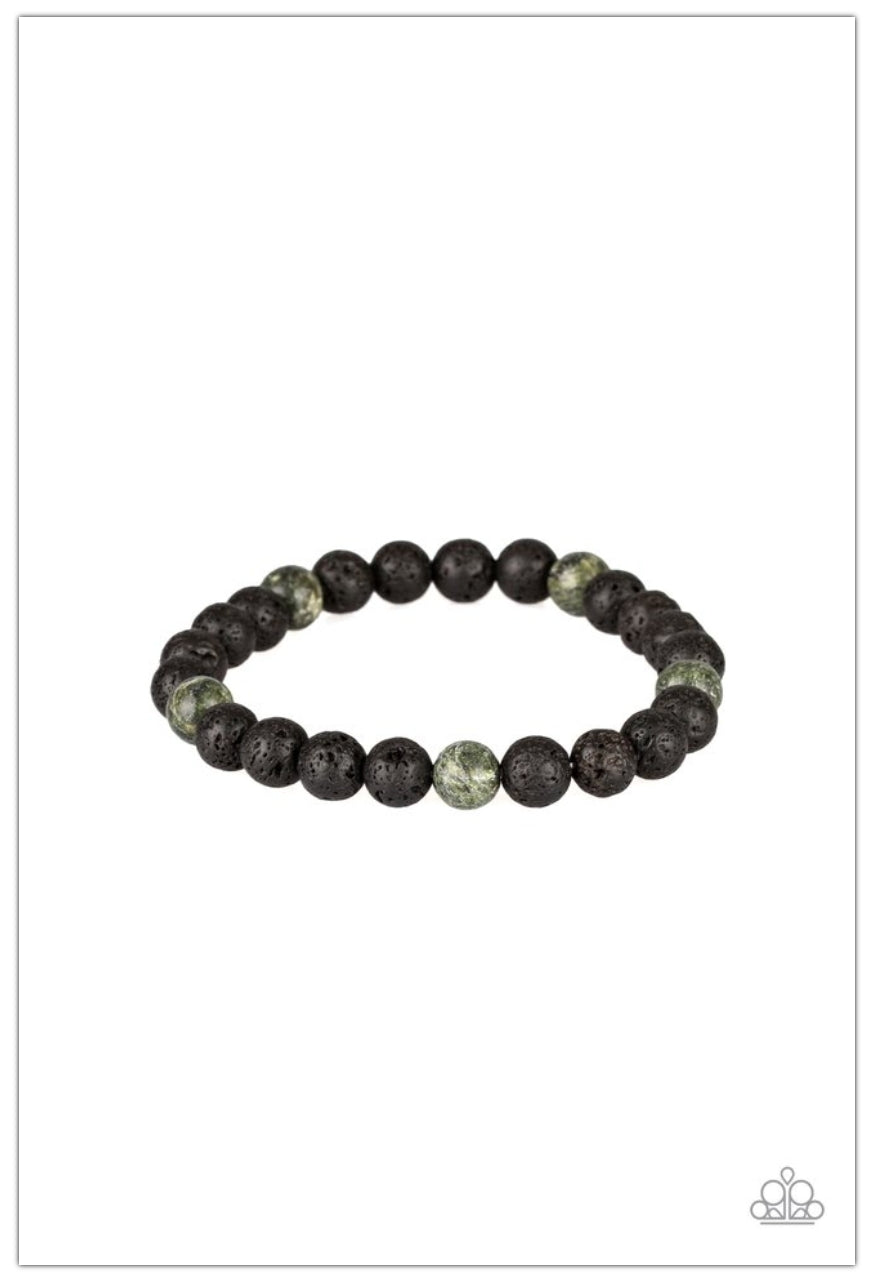 An earthy collection of black lava stones and green stones are threaded along a stretchy band around the wrist for a seasonal look.