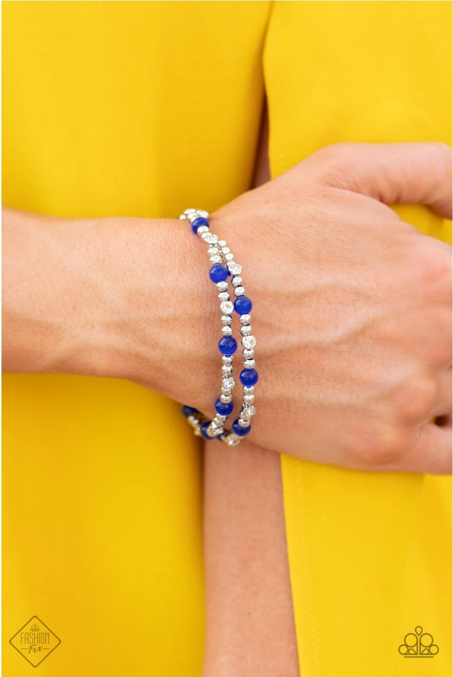 A glittery compilation of glassy white rhinestones, shiny silver beads, and glowing Classic Blue cat's eye beads are delicately threaded along a wire to create an ethereal infinity wrap bracelet.