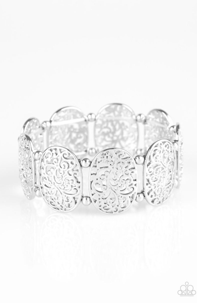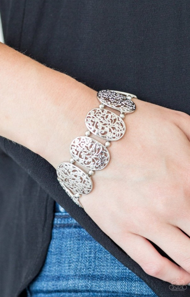 Brushed in a high-sheen finish, vine-like filigree climbs glistening silver frames. Infused with dainty silver beads, the elegant frames are threaded along stretchy bands, creating a refined look around the wrist.