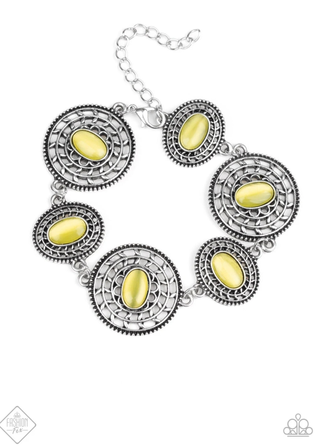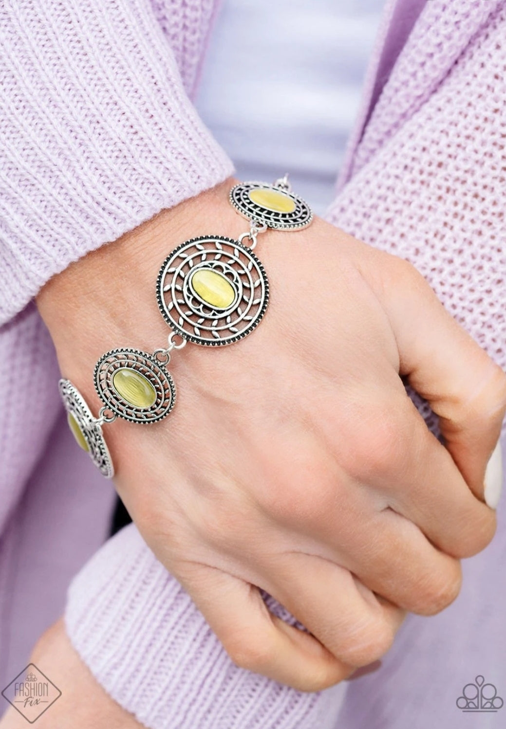 Dotted with glowing yellow cat's eye accents, a collection of vintage-inspired silver frames connect across the wrist. The ornate oval casings swirl with studded patterns and vine-like filigree for a seasonal flair. Features an adjustable clasp closure.