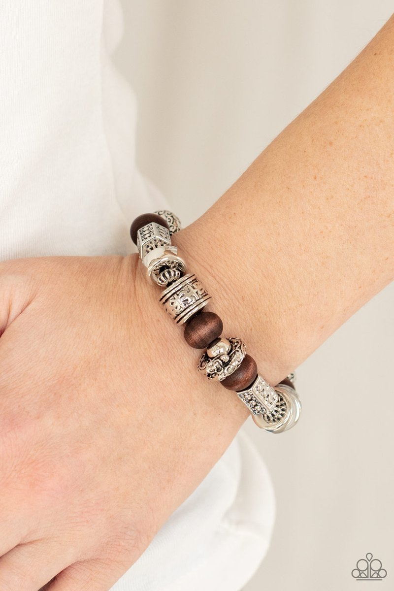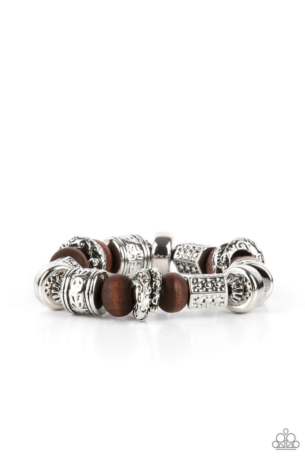 Stamped, studded, and embossed in tribal inspired patterns, a collection of chunky silver beads join earthy wooden beads along a stretchy band around the wrist for an earthy flair.