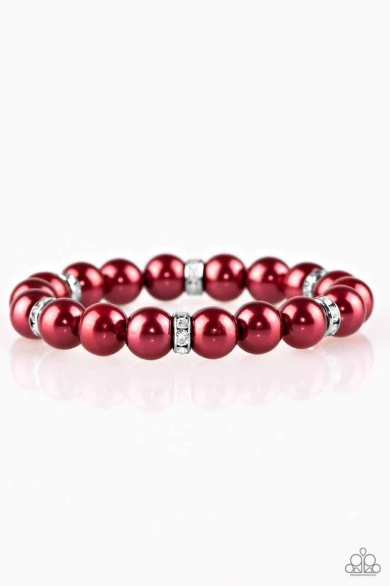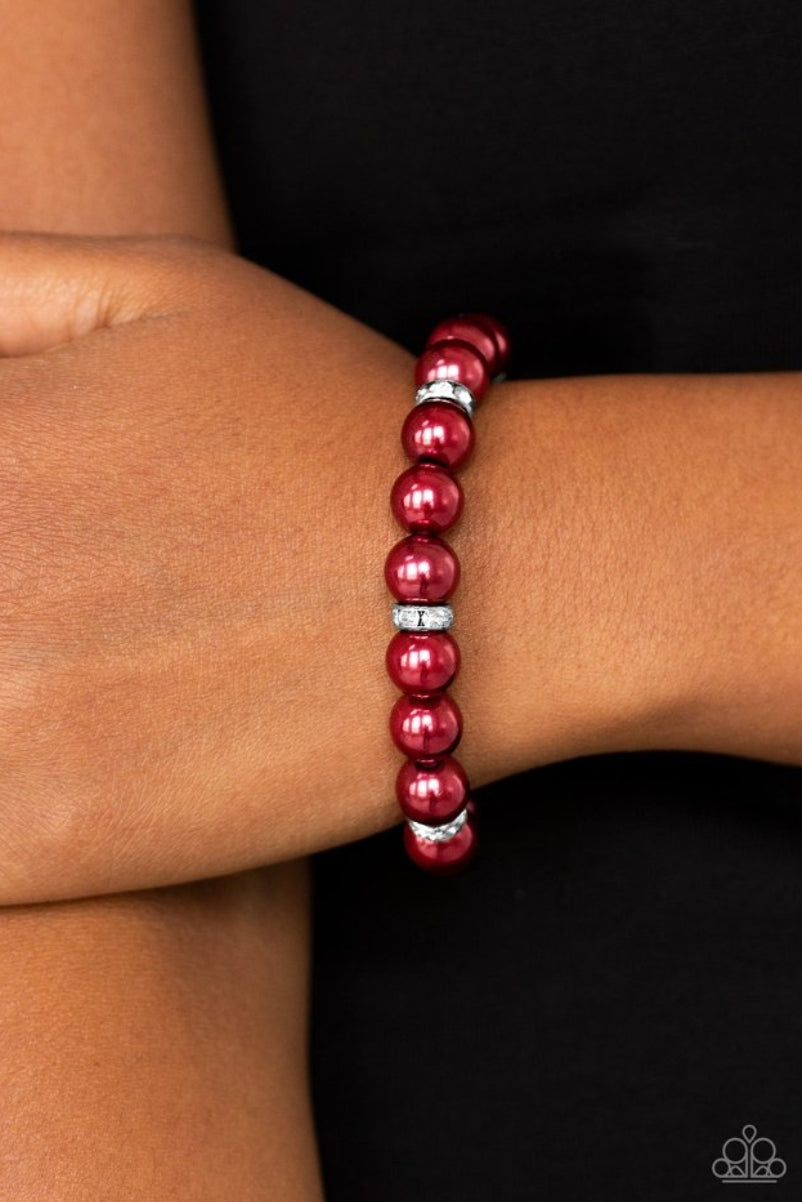 Classic red pearls and glittery white rhinestone encrusted rings are threaded along a stretchy band, creating a timeless centerpiece around the wrist.