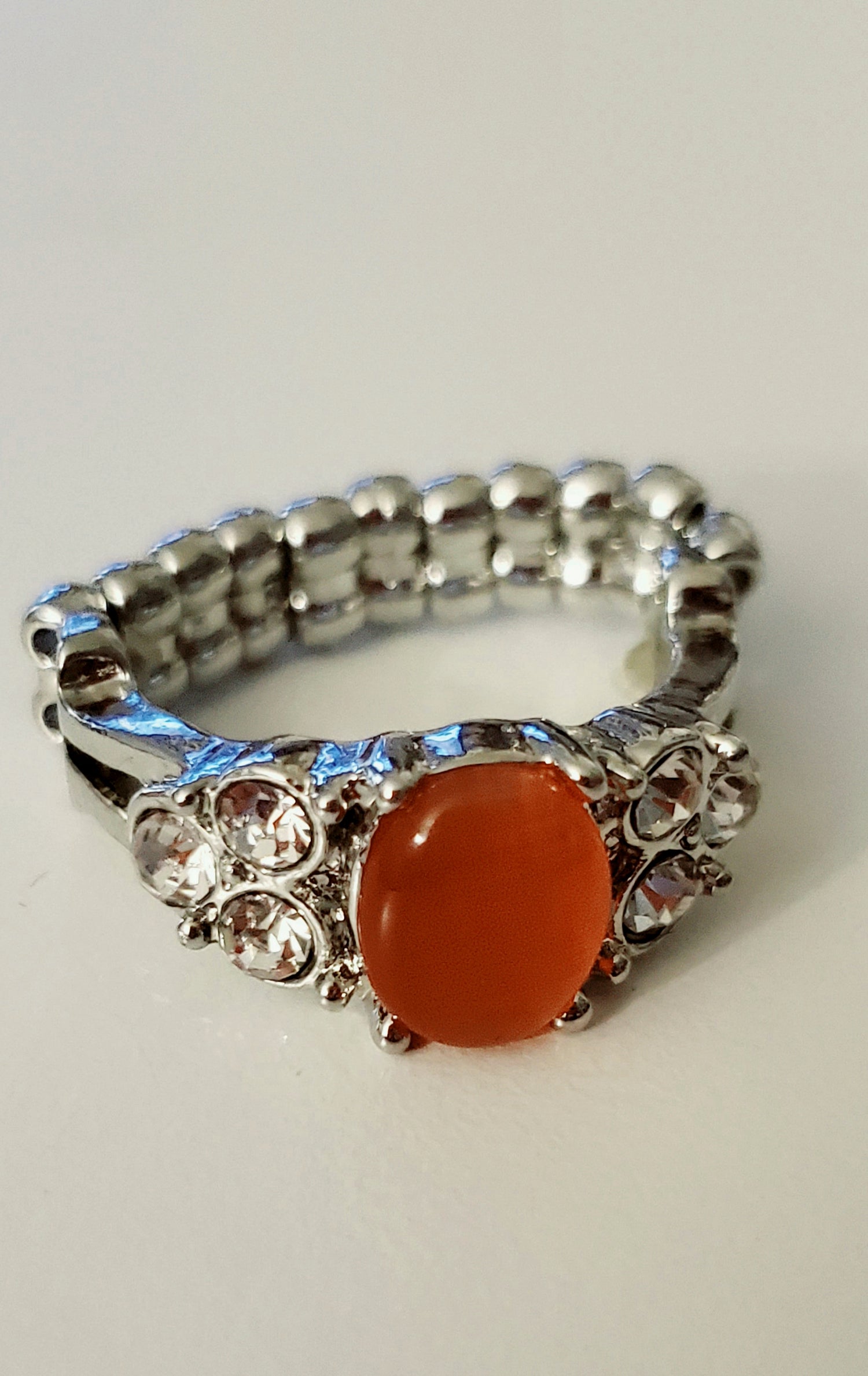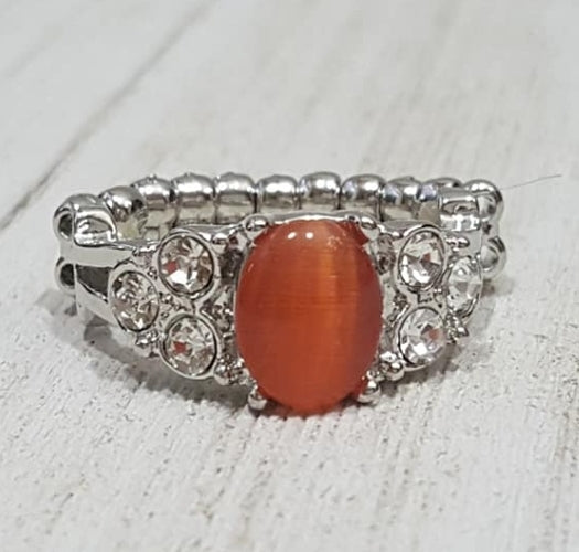 A glowing orange moonstone is pressed into the center of a dainty silver band radiating with glassy white rhinestones for a glamorous look. Features a dainty stretchy band for a flexible fit.
