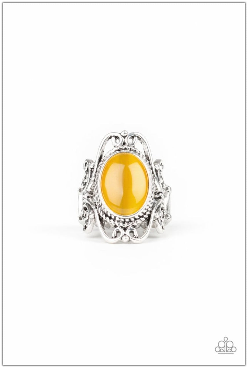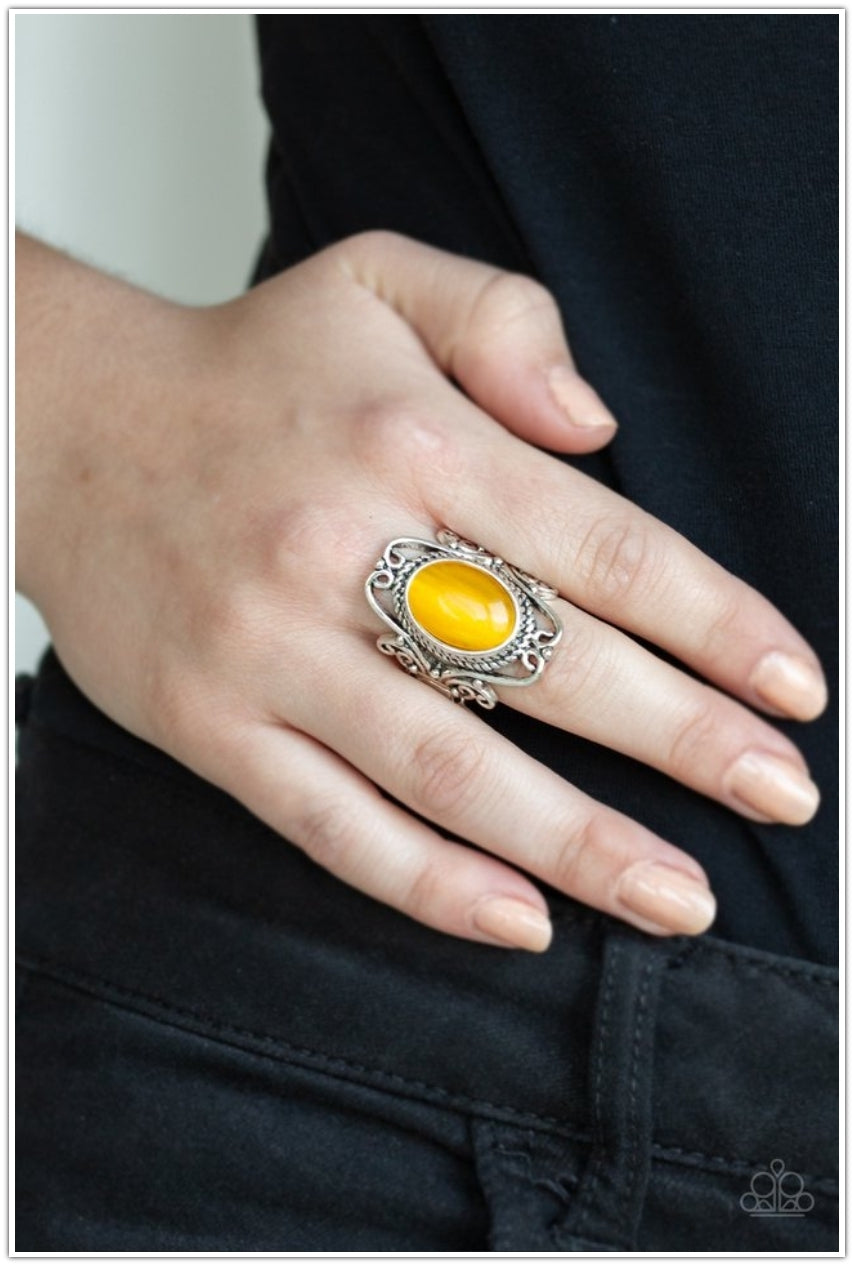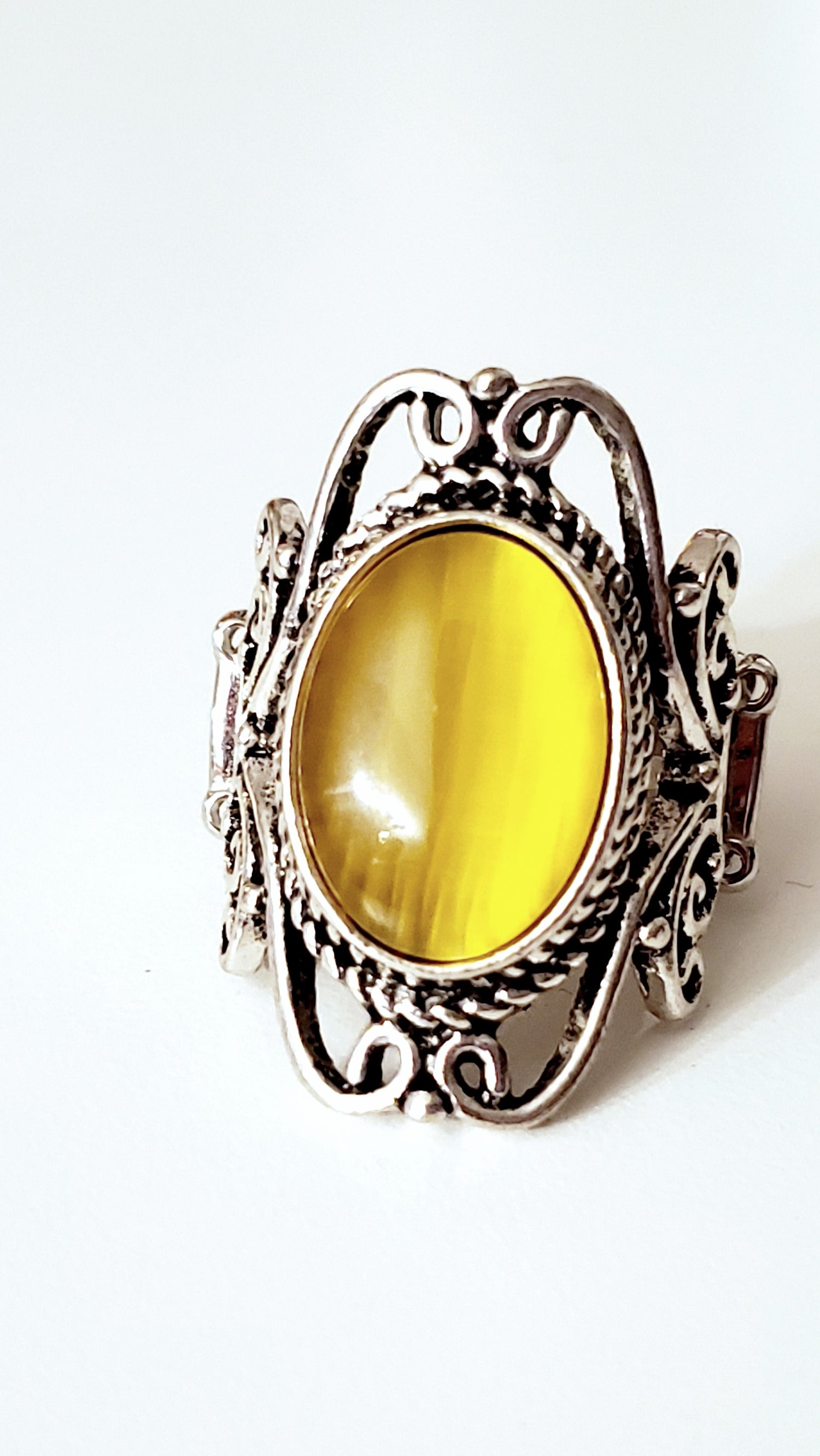 A glowing yellow cat's eye stone is nestled inside of an airy silver frame radiating with frilly filigree for a whimsical look atop the finger. Features a stretchy band for a flexible fit.