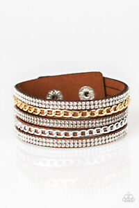 Glassy white and smoky rhinestones are encrusted along strands of brown suede. Glistening silver and gold chains are added to the bands, adding edgy industrial shimmer to the sassy palette. Features an adjustable snap closure. Sold as one individual bracelet.