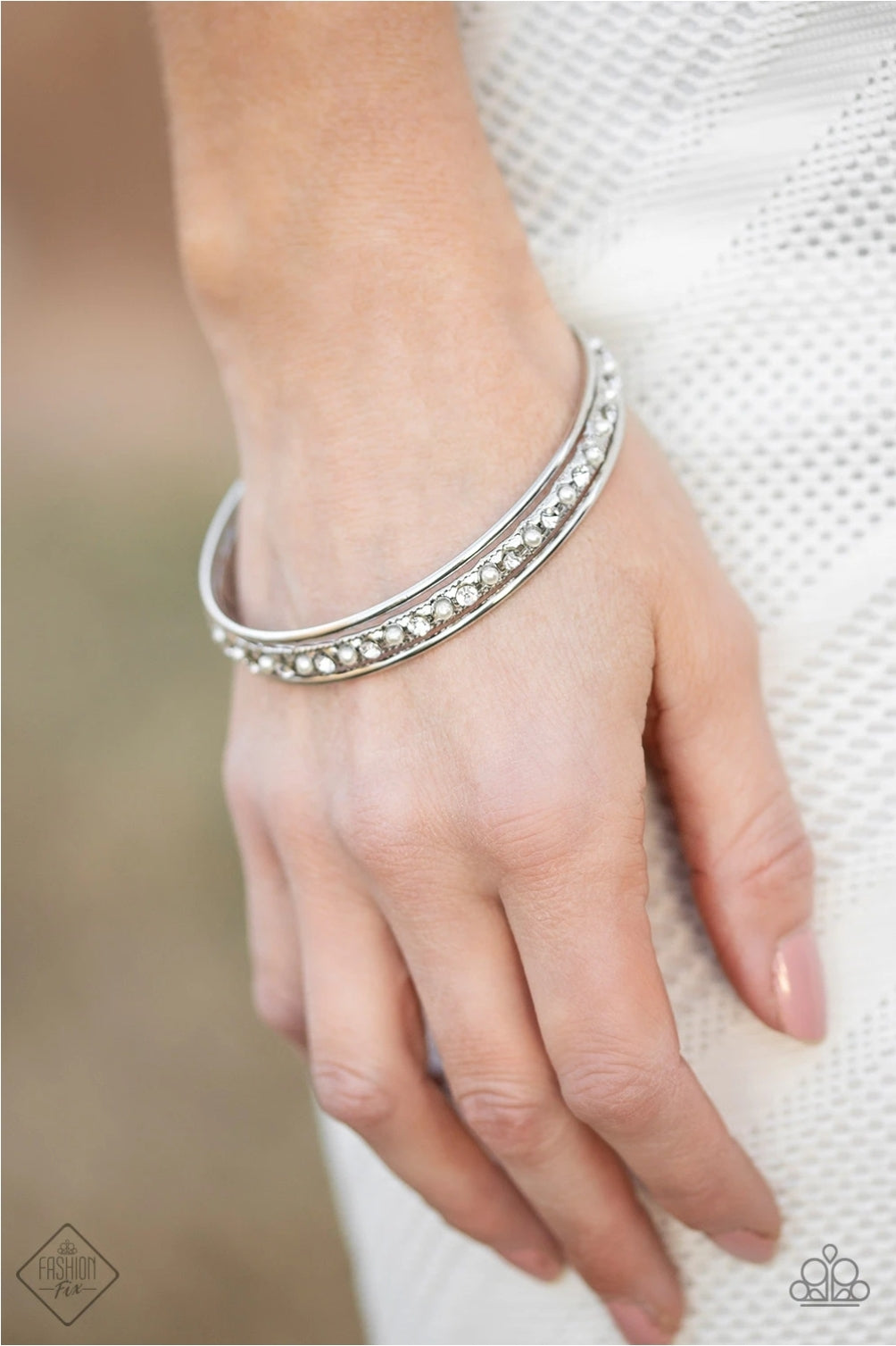 Bracelet: Ballroom Bauble - A silver bangle adorned in shimmery white pearls and glistening white rhinestones is paired with two classic silver bangles for a layered look.