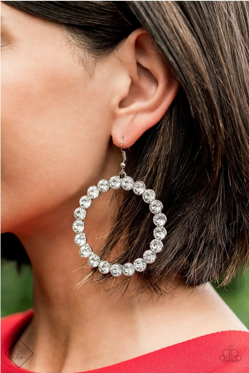 EARRINGS: Welcome To The GLAM-boree - White ... Featuring sleek silver fittings, oversized white rhinestones spin into a glittery hoop with a blinding finish. Earring attaches to a standard fishhook fitting.
