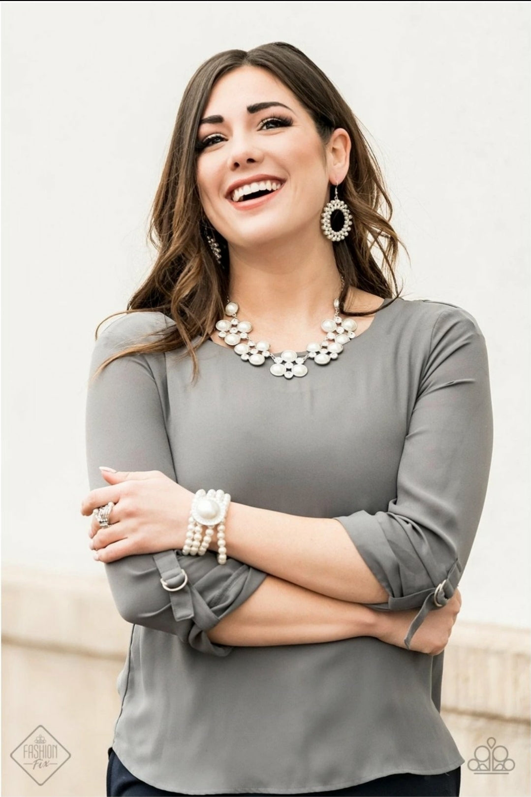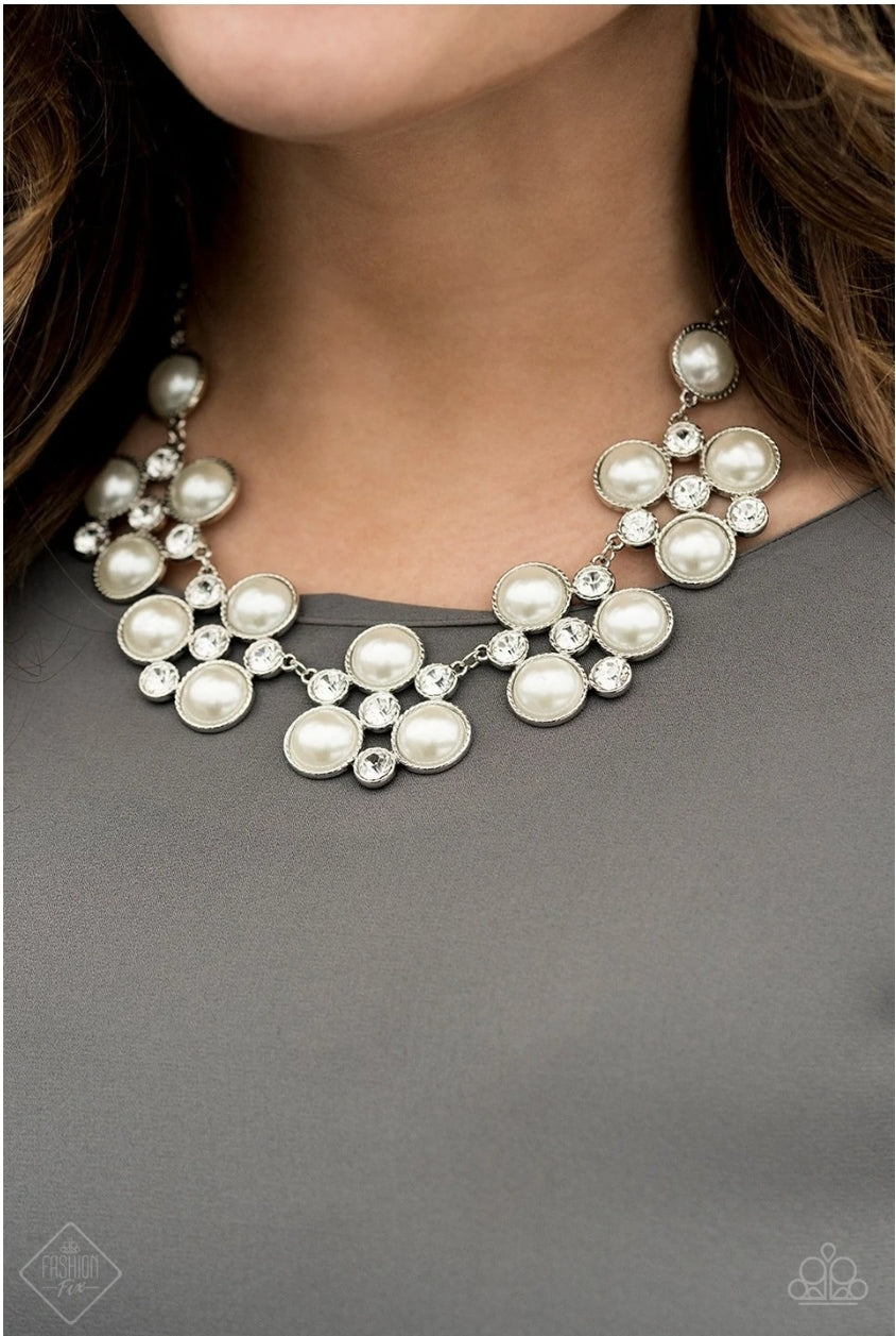 Necklace - "Night At The Symphony" - Sleek silver frames adorned in a refined mix of oversized white pearls and glassy white rhinestones, delicately link below the collar for a dramatically glamorous look. Features an adjustable clasp closure.