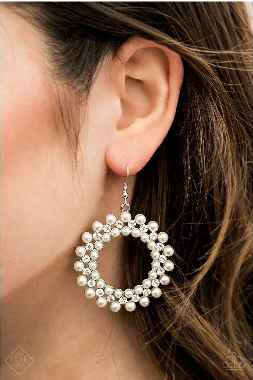Earrings - "Pearly Poise" - Rings of pearly white beads and glassy white rhinestones alternate as they ripple into a stunning statement piece. Earring attaches to a standard fishhook fitting.