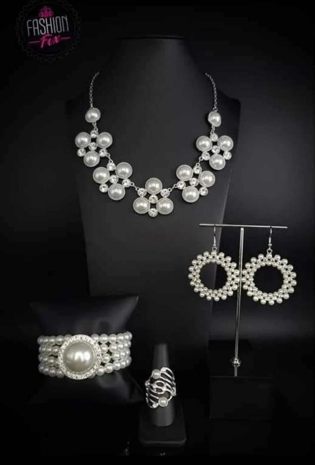 Ring - "Dancing Diamonds" - Dotted in glassy white rhinestones and dainty white pearls, whirling silver bands sweep across the finger in a refined finish. Features a stretchy band for a flexible fit.