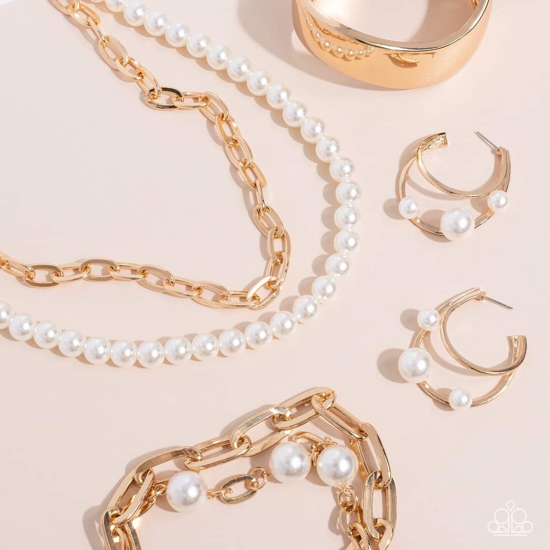 BRACELET: Nautical Mileage - Gold - P9BA-GDXX-118JS -- A strand of elongated, oversized gold links layers with a strand of identical links in a slightly smaller size as they wrap around the wrist. Three classic white pearls dot the strand of smaller links, adding a soft, refined contrast to the industrial chains. Features an adjustable clasp closure.
