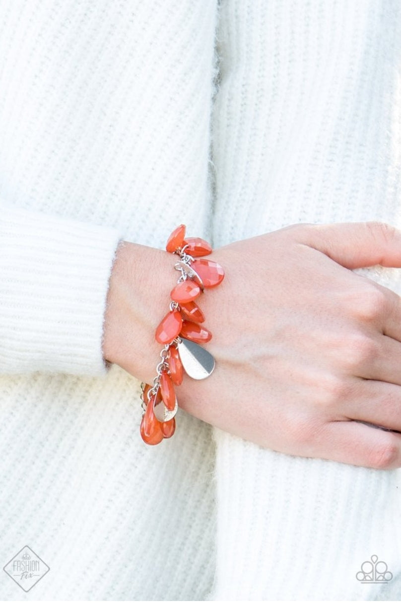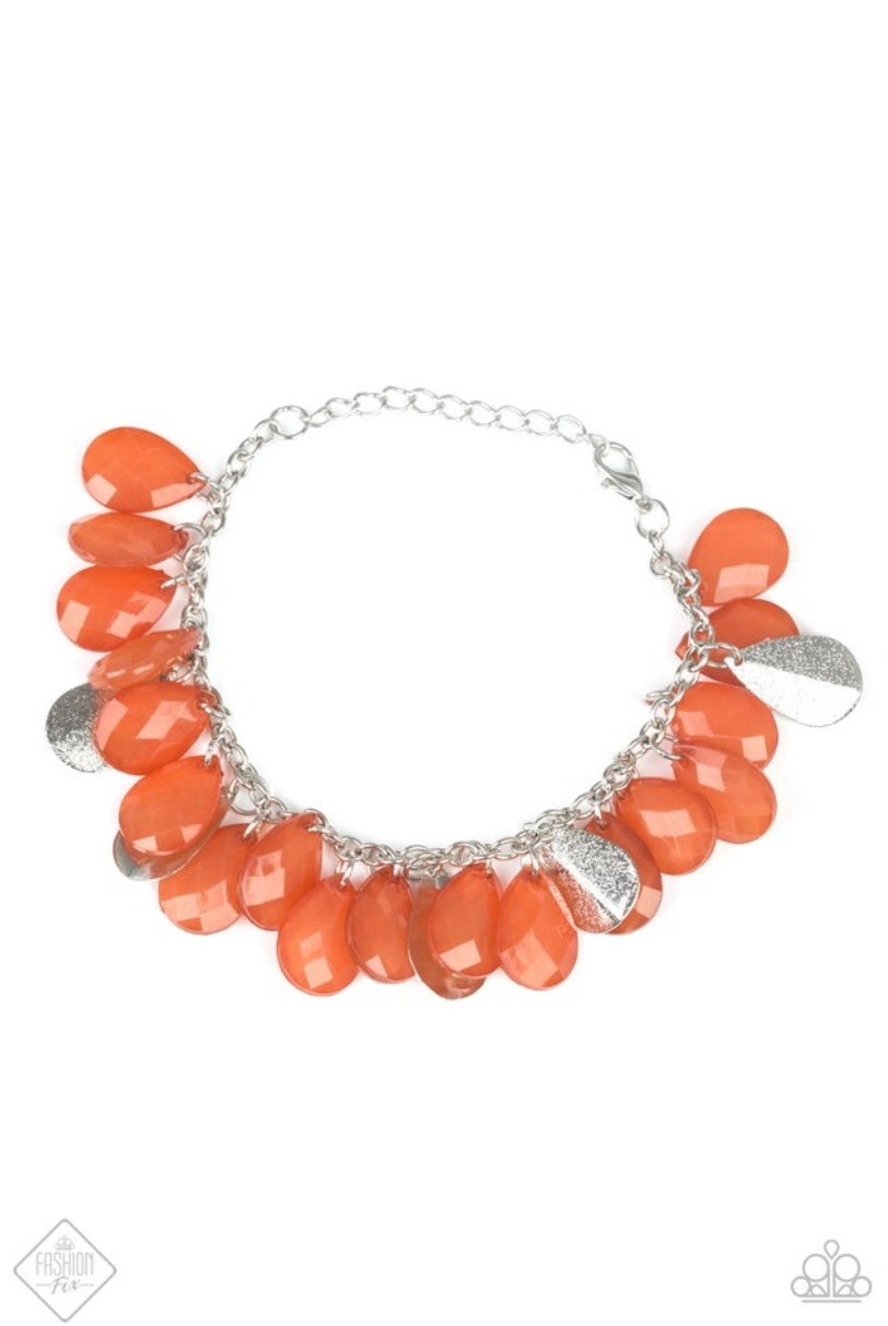 A silver chain is adorned in a flirtatious fringe of faceted burnt orange teardrops. Glittery beveled silver teardrops are sprinkled between the orange beading, adding hints of shimmer to the vivacious design. Features an adjustable clasp closure.