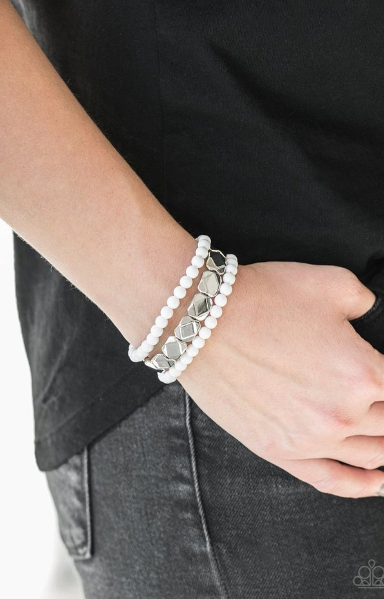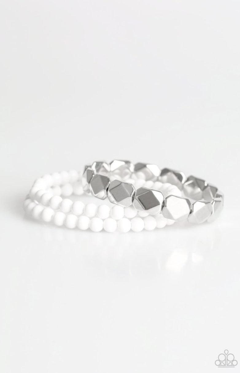 A collection of polished white and faceted silver beads are threaded along stretchy bands, creating colorful layers around the wrist.