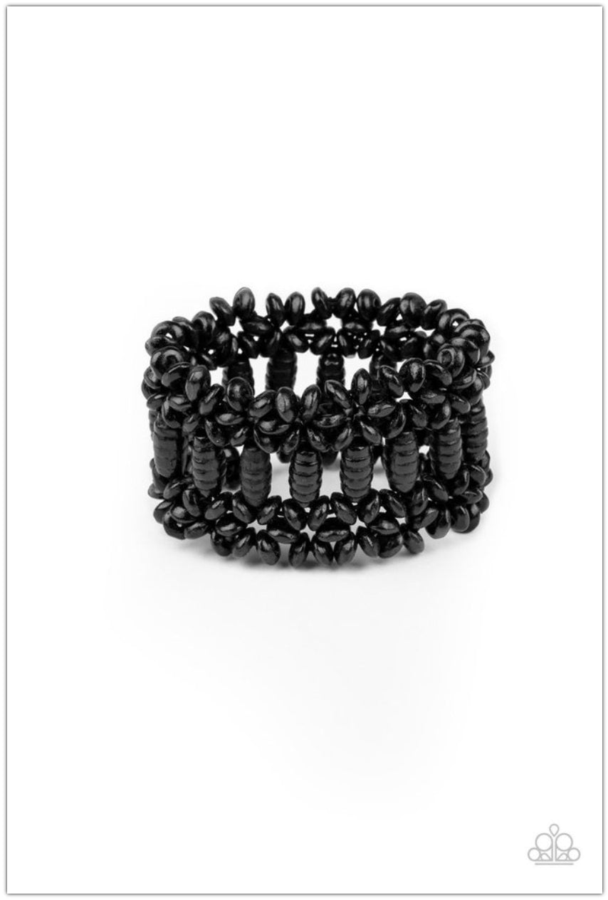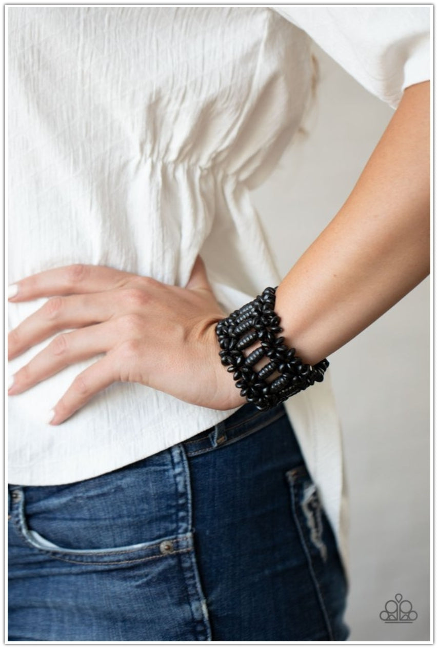 Painted in a shiny black finish, round and oval wooden beads are threaded along stretchy bands that weave into a colorful floral patterned stretch bracelet around the wrist.