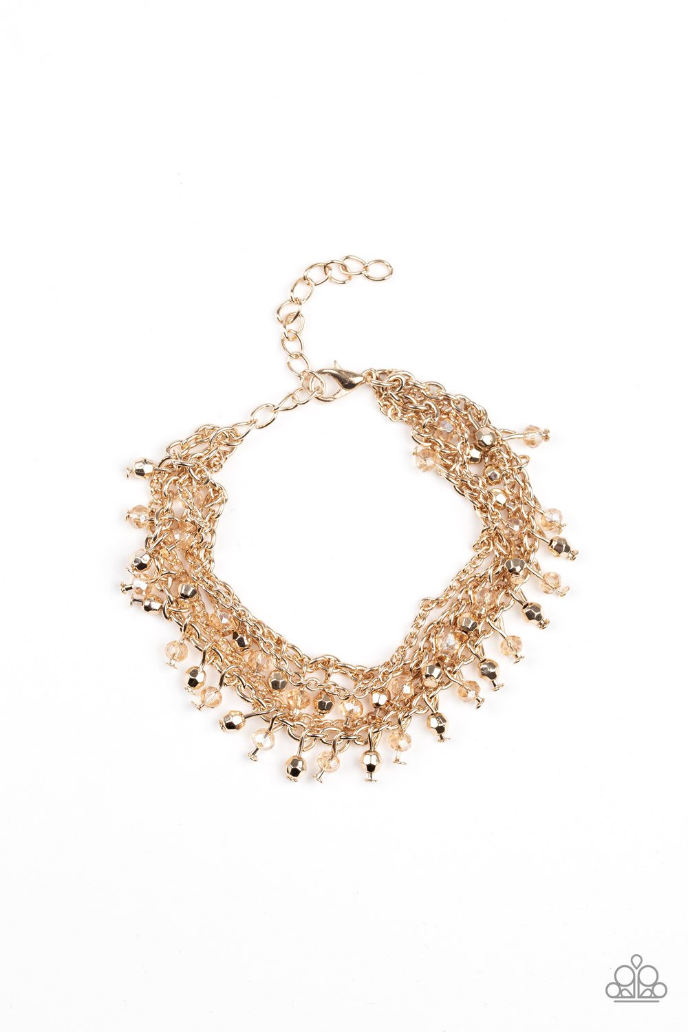BRACELET: Dainty gold and crystal-like beads cascade from two shimmery gold chains. Infused with plain gold chains, the colorful strands layer around the wrist for a flirtatious look. Features an adjustable clasp closure. P9RE-GDXX-170CC