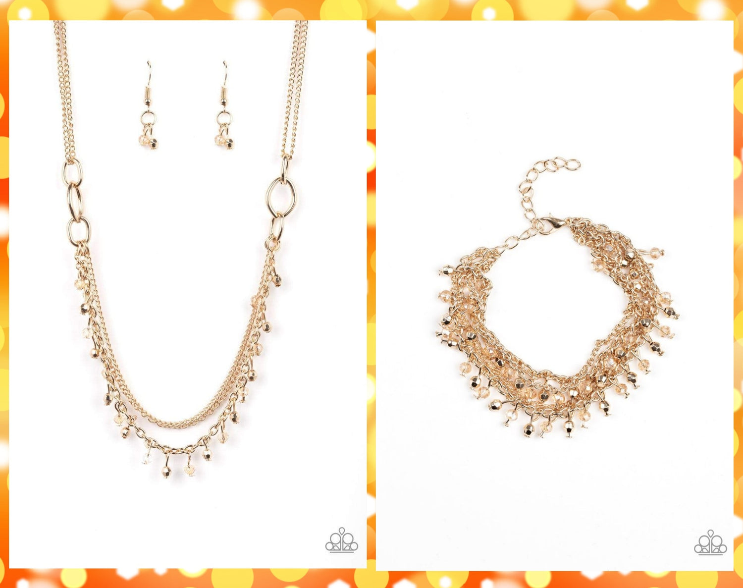 NECKLACE: Dainty gold and crystal-like beads cascade from two shimmery gold chains. Infused with plain gold chains, the colorful strands layer below the collar for a flirtatious look. Features an adjustable clasp closure. P2RE-GDXX-257CC