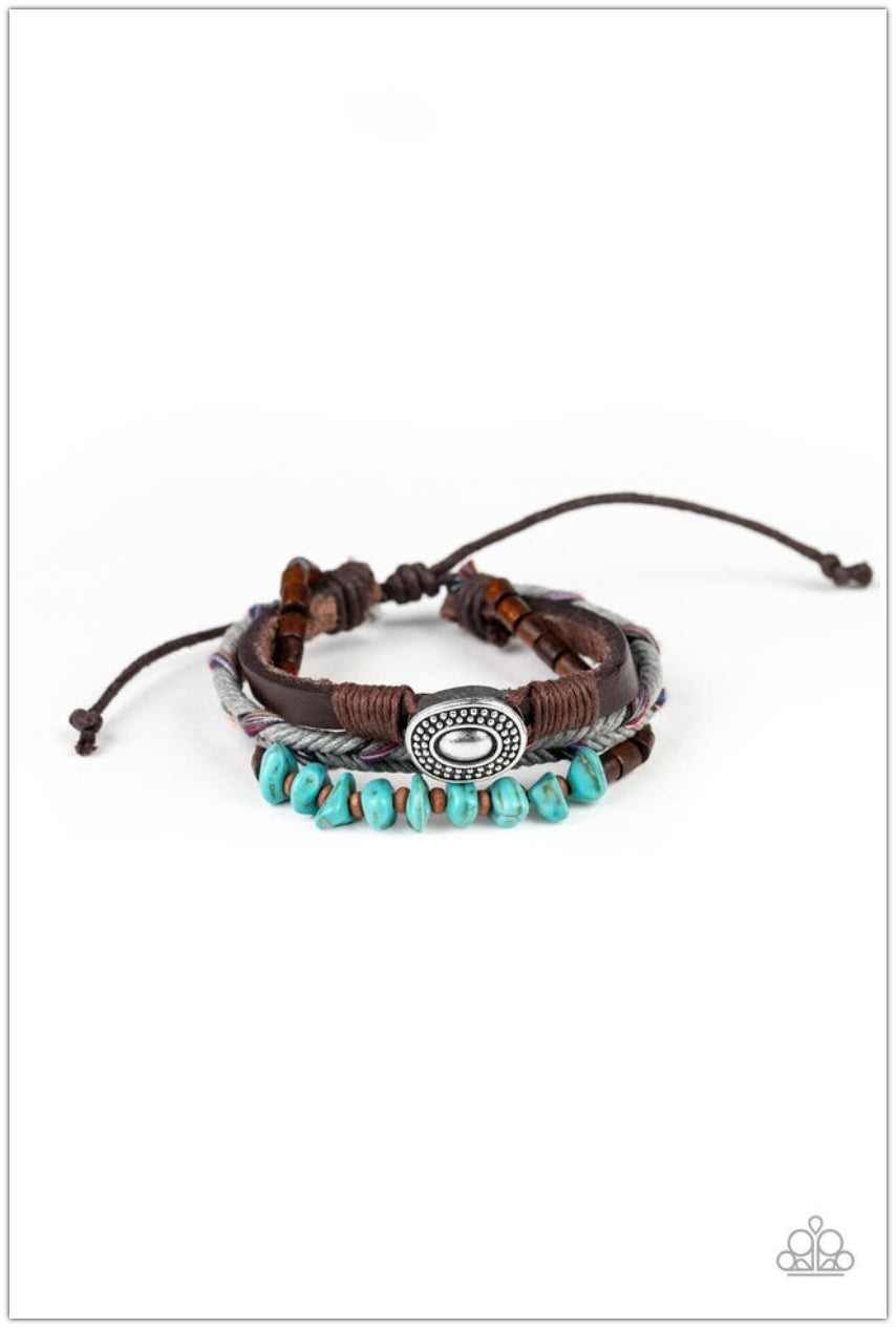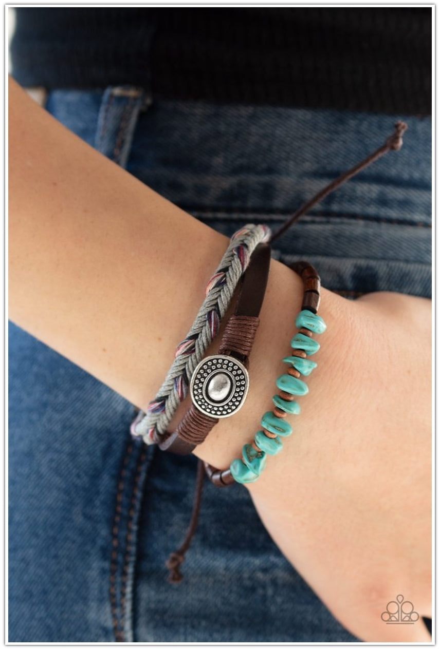 Colorfully braided cording, a thick leather band, and a strand of wooden beads and refreshing turquoise stones layer across the wrist for a seasonal look. Features an adjustable sliding knot closure.