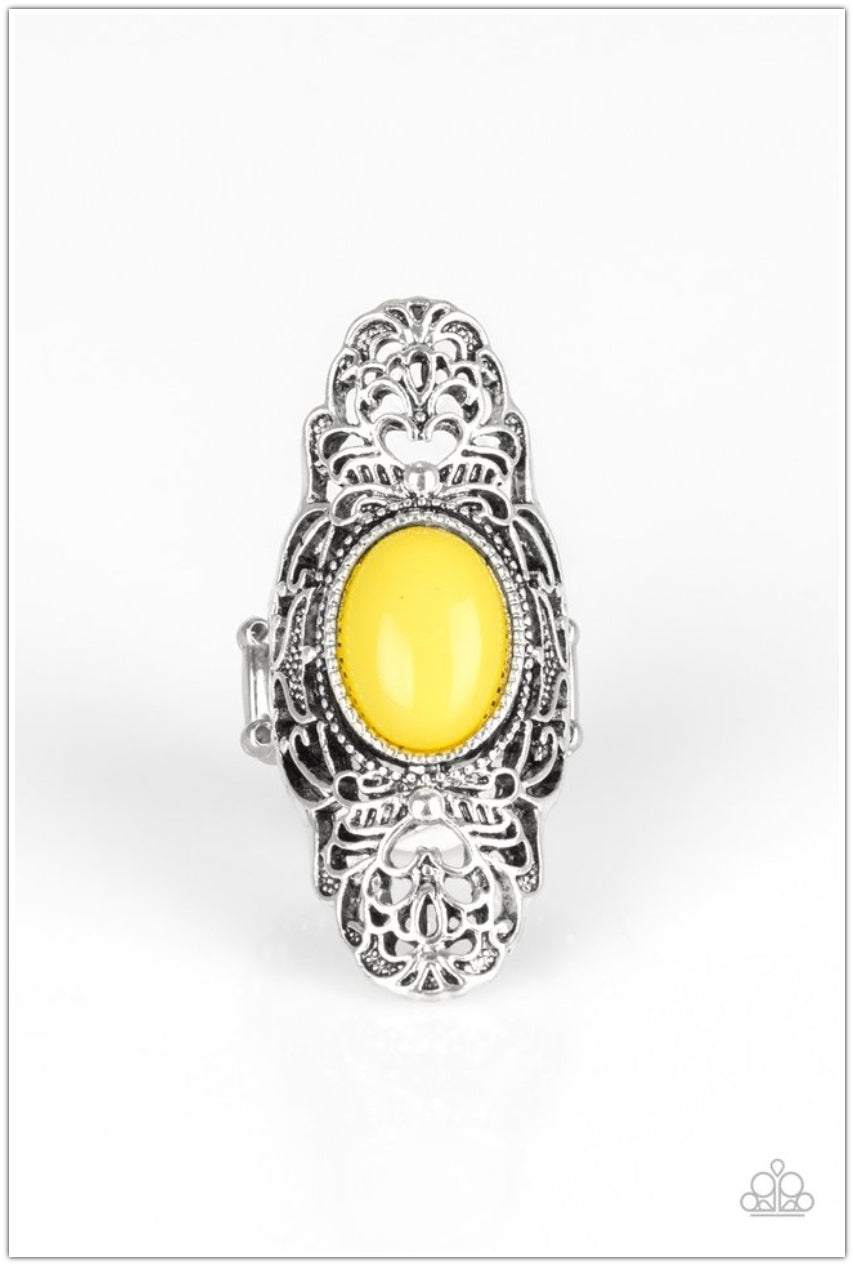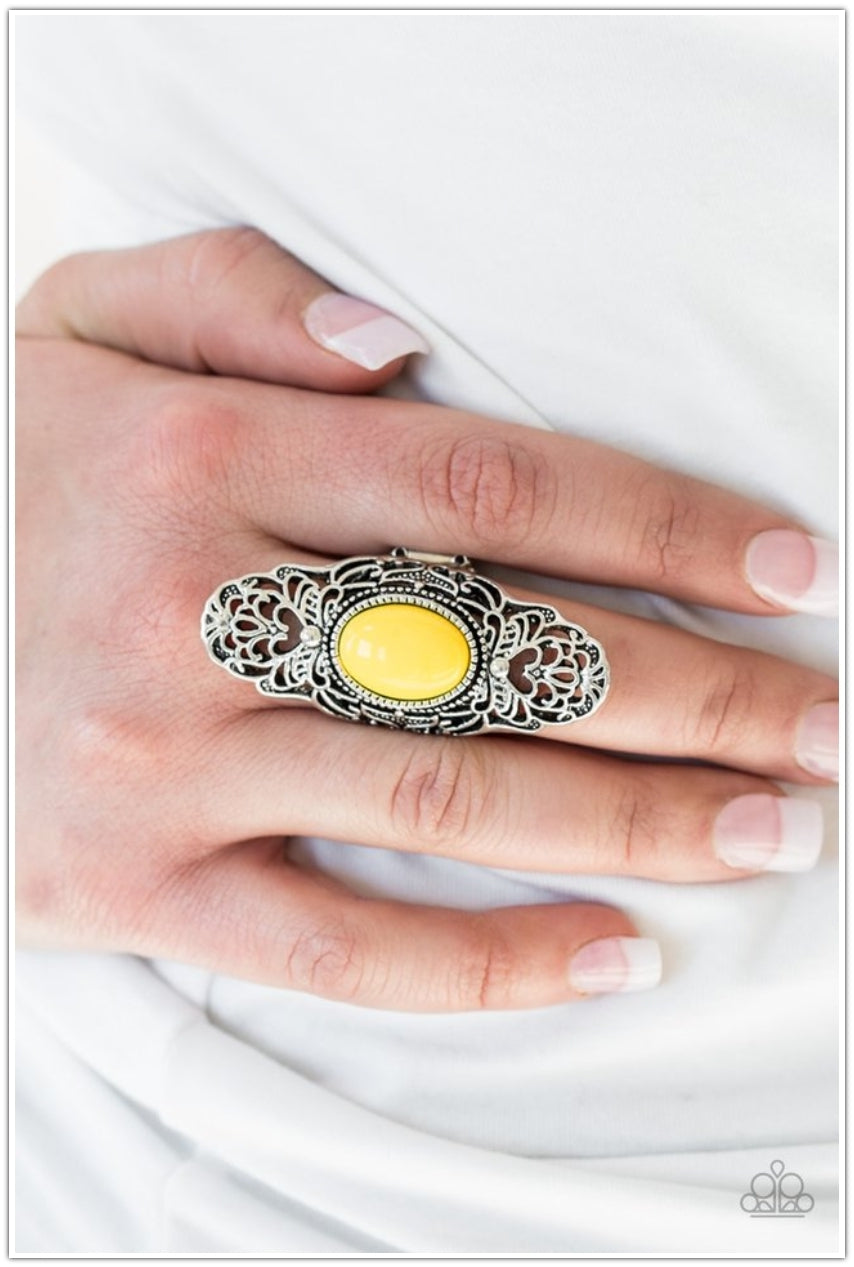 A pearly brown bead is pressed into a white rhinestone encrusted frame, creating the illusion of a floating centerpiece atop the finger. Features a dainty stretchy band for a flexible fit.