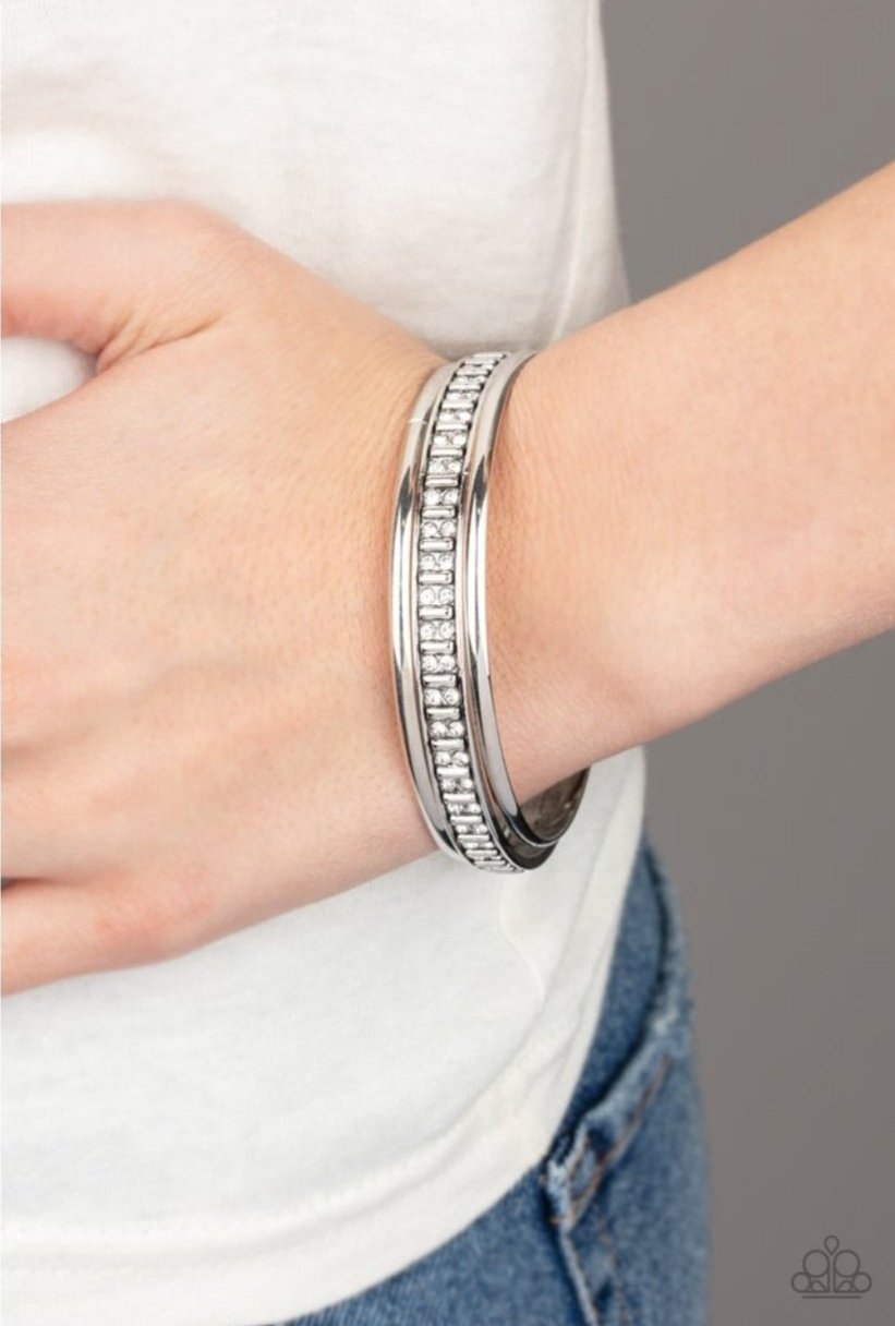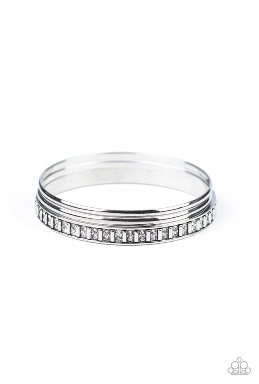 Two classic silver bangles join a thick silver bangle that has been encrusted in pairs of dainty white rhinestones and rectangular silver beading for an edgy refinement.