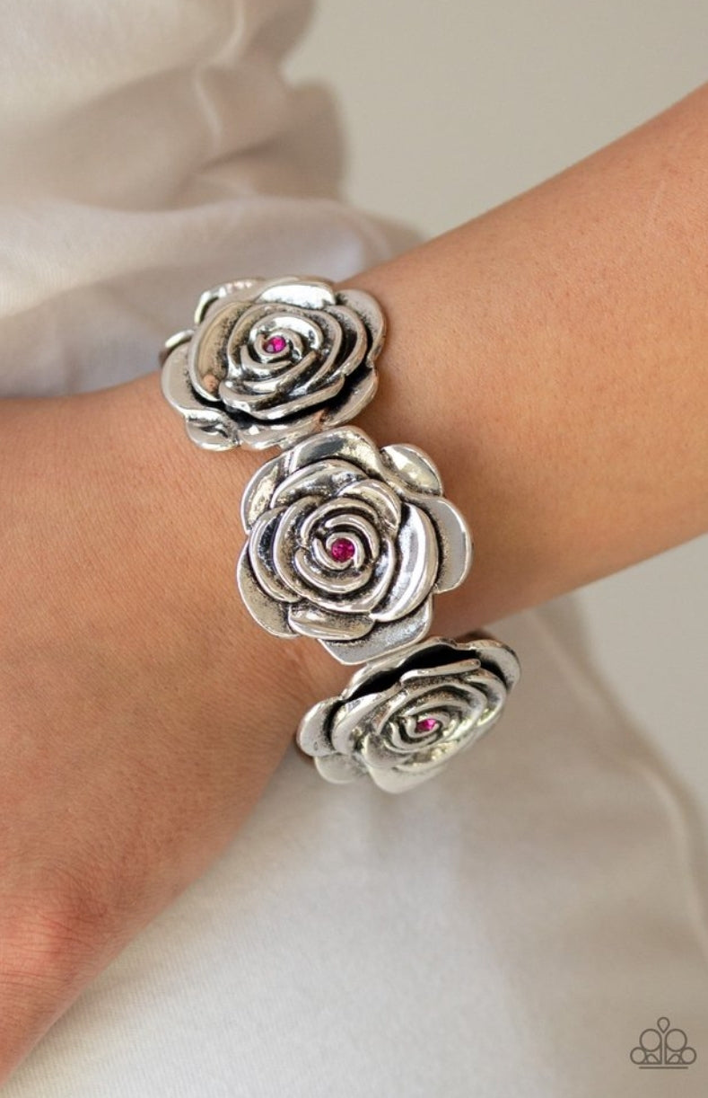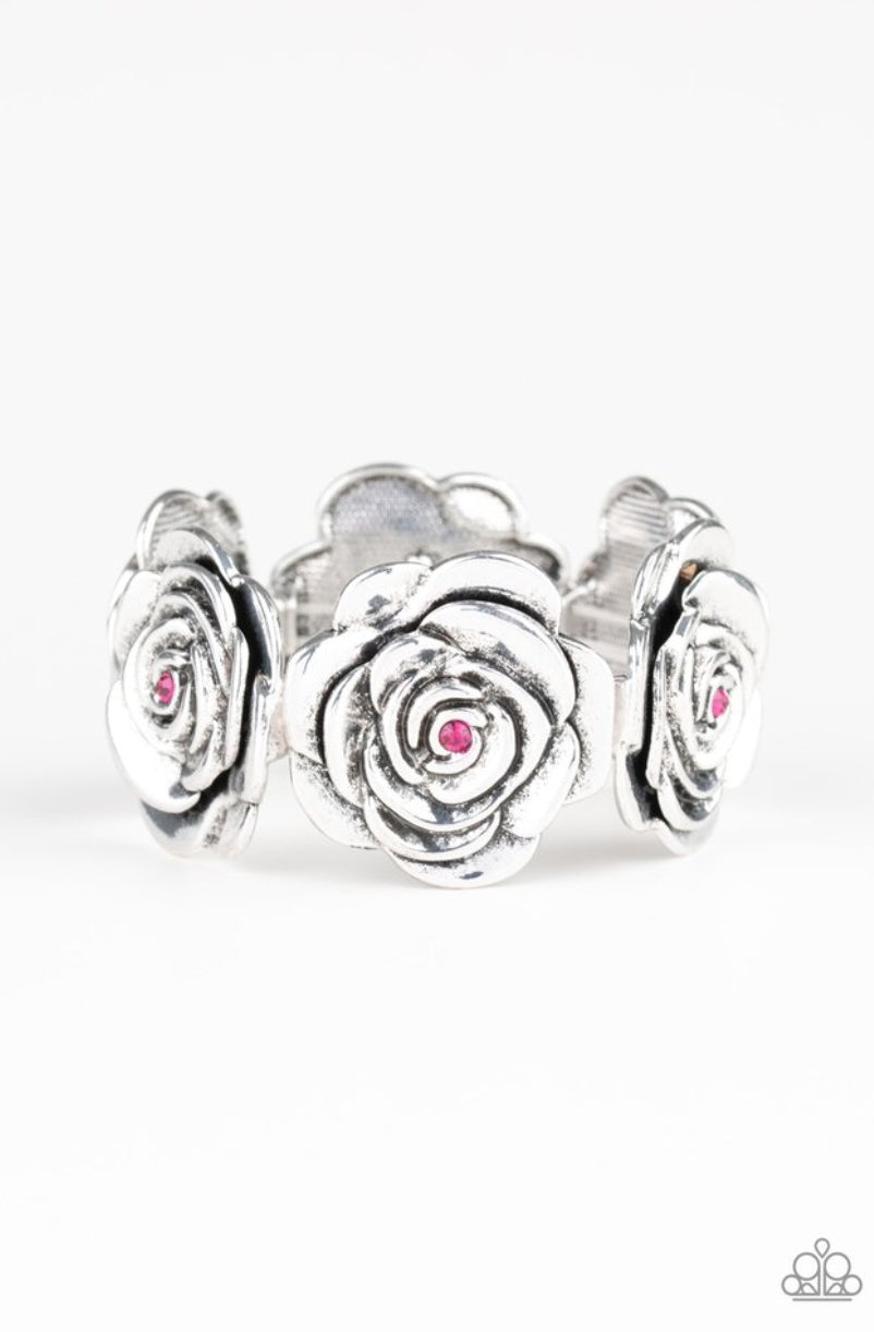 Dotted with dainty pink rhinestone centers, a collection of oversized silver rosebud frames are threaded along stretchy bands around the wrist for a whimsical look.