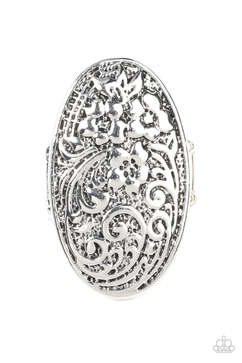 A billowing floral motif blooms across the front of a rustic silver oval frame, resulting in a seasonal centerpiece atop the finger. Features a stretchy band for a flexible fit.