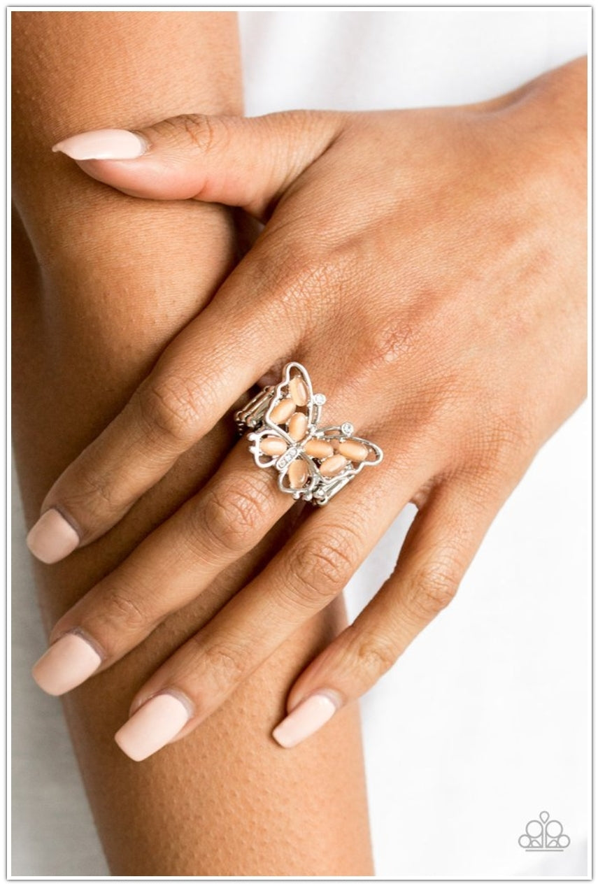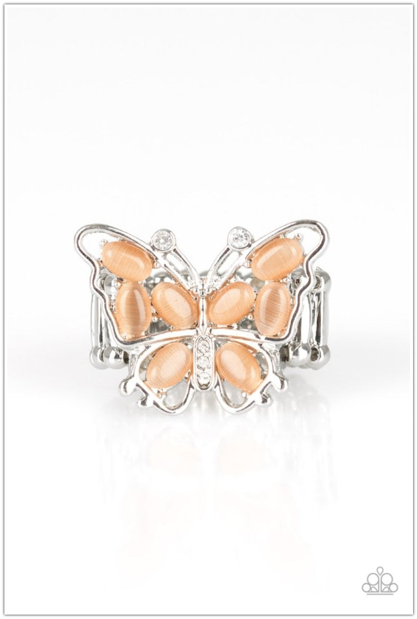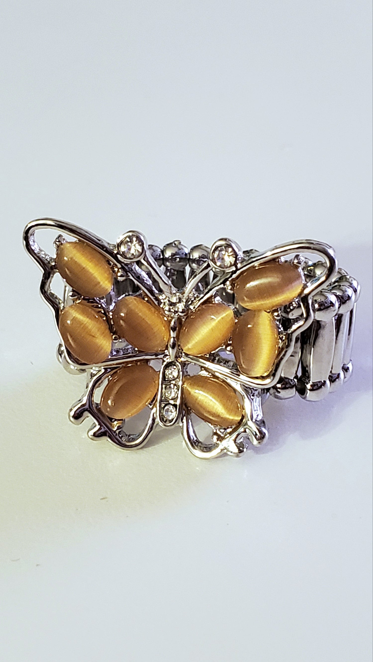 Dotted with glittery white rhinestones, an orange moonstone encrusted butterfly perches atop the finger for a whimsical flair. Features a stretchy band for a flexible fit.