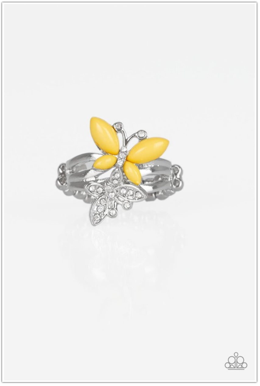 Infused with dainty white rhinestones, a yellow beaded butterfly joins a white rhinestone encrusted butterfly atop stacked silver bands for a whimsical fashion. Features a dainty stretchy band for a flexible fit.