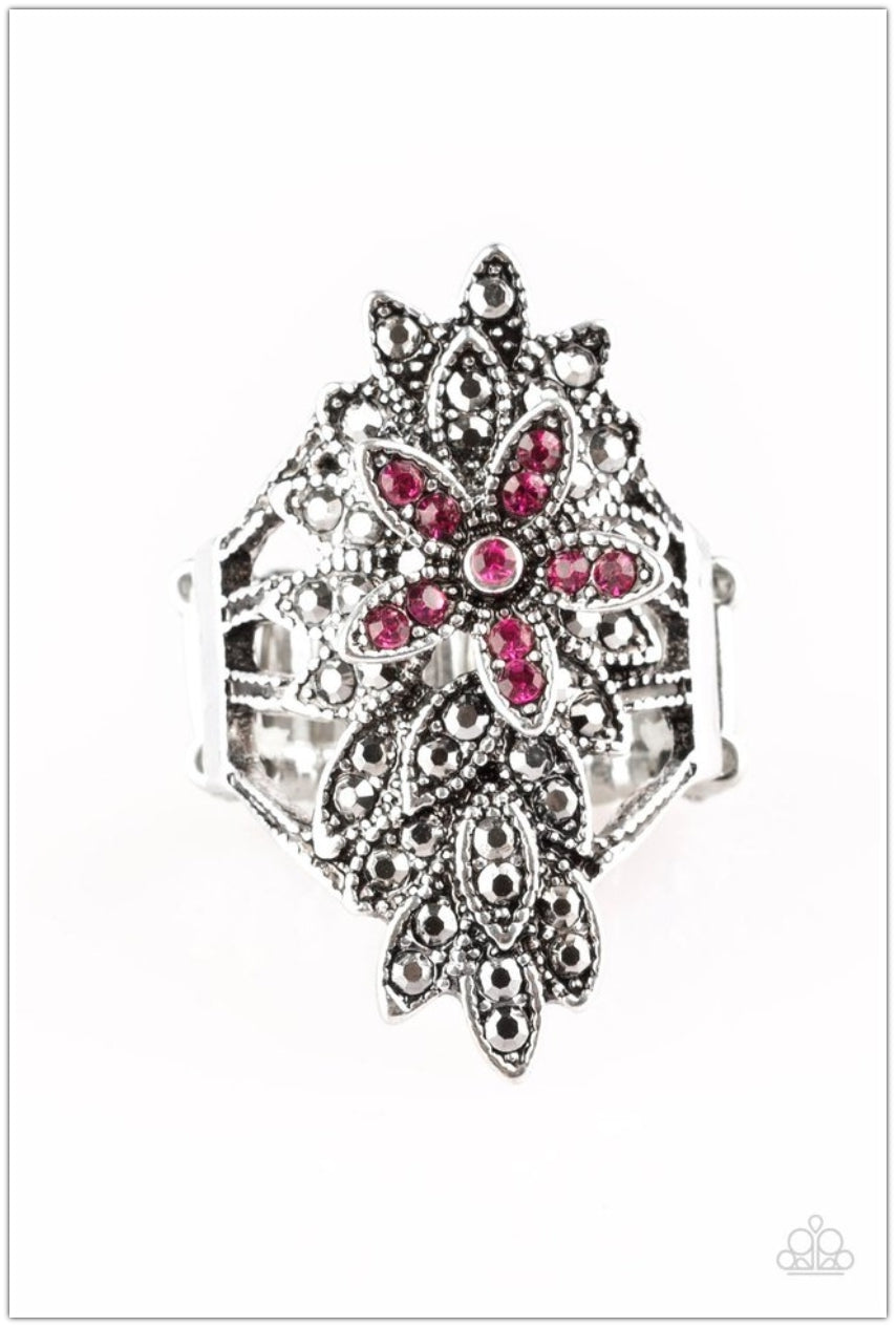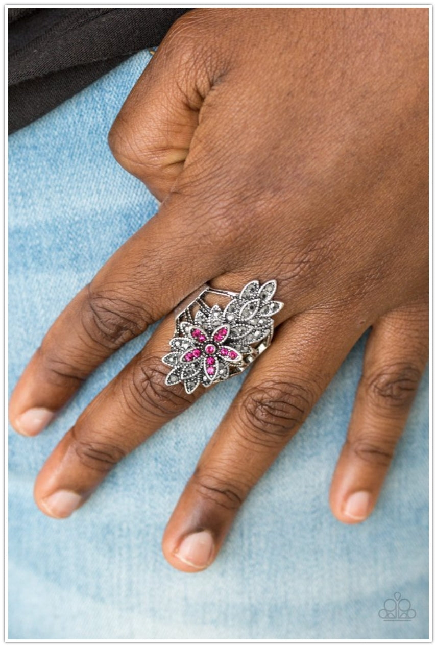 Encrusted in dainty hematite rhinestones, marquise shaped silver frames layer across the finger. Sprinkled in glittery pink rhinestones, a sparkling flower blooms atop the frame for a whimsical finish. Features a stretchy band for a flexible fit.