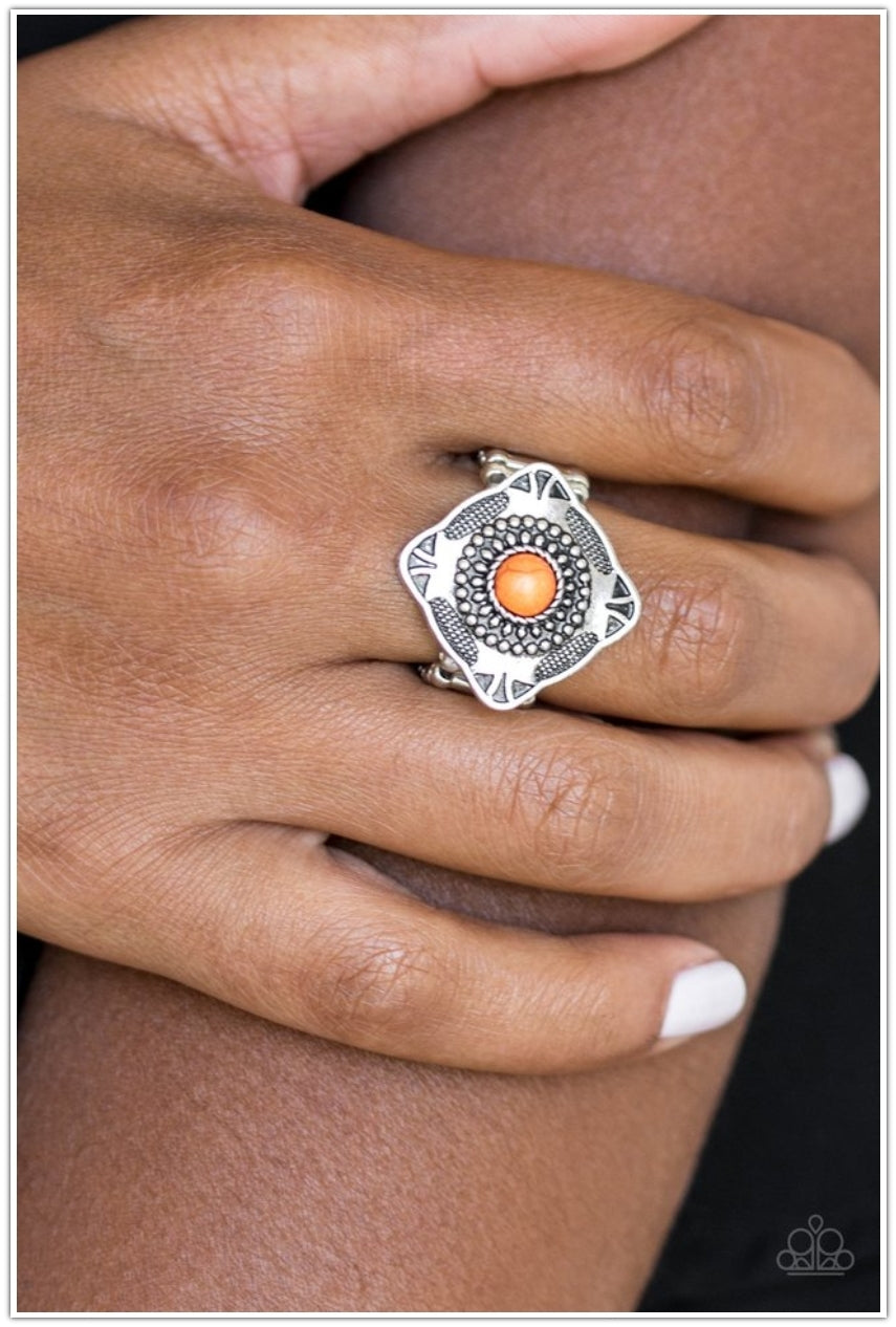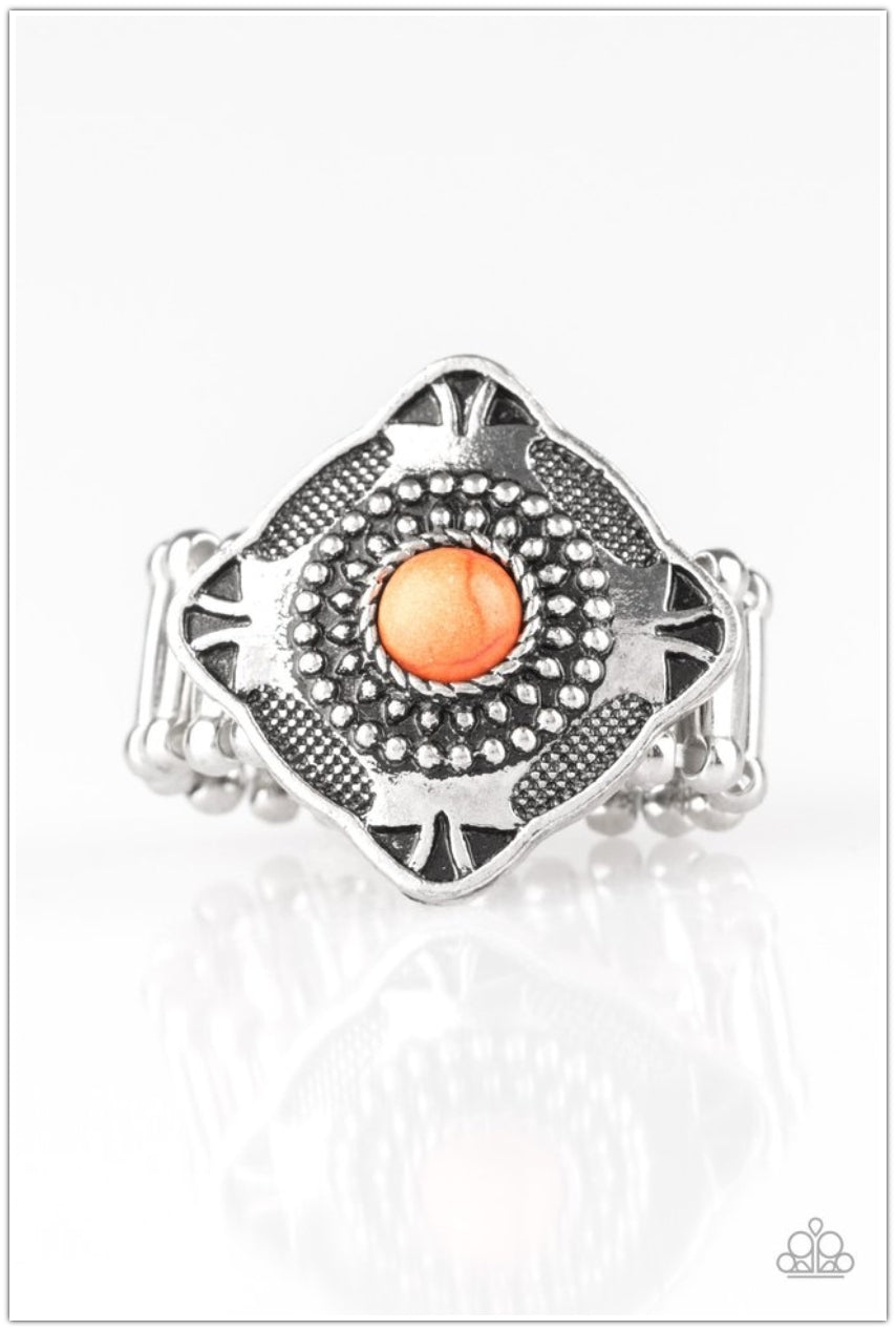 Embossed and studded in tribal inspired patterns, a tilted square frame sits atop the finger. A vivacious orange stone dots the center of the frame for a seasonal finish. Features a stretchy band for a flexible fit.