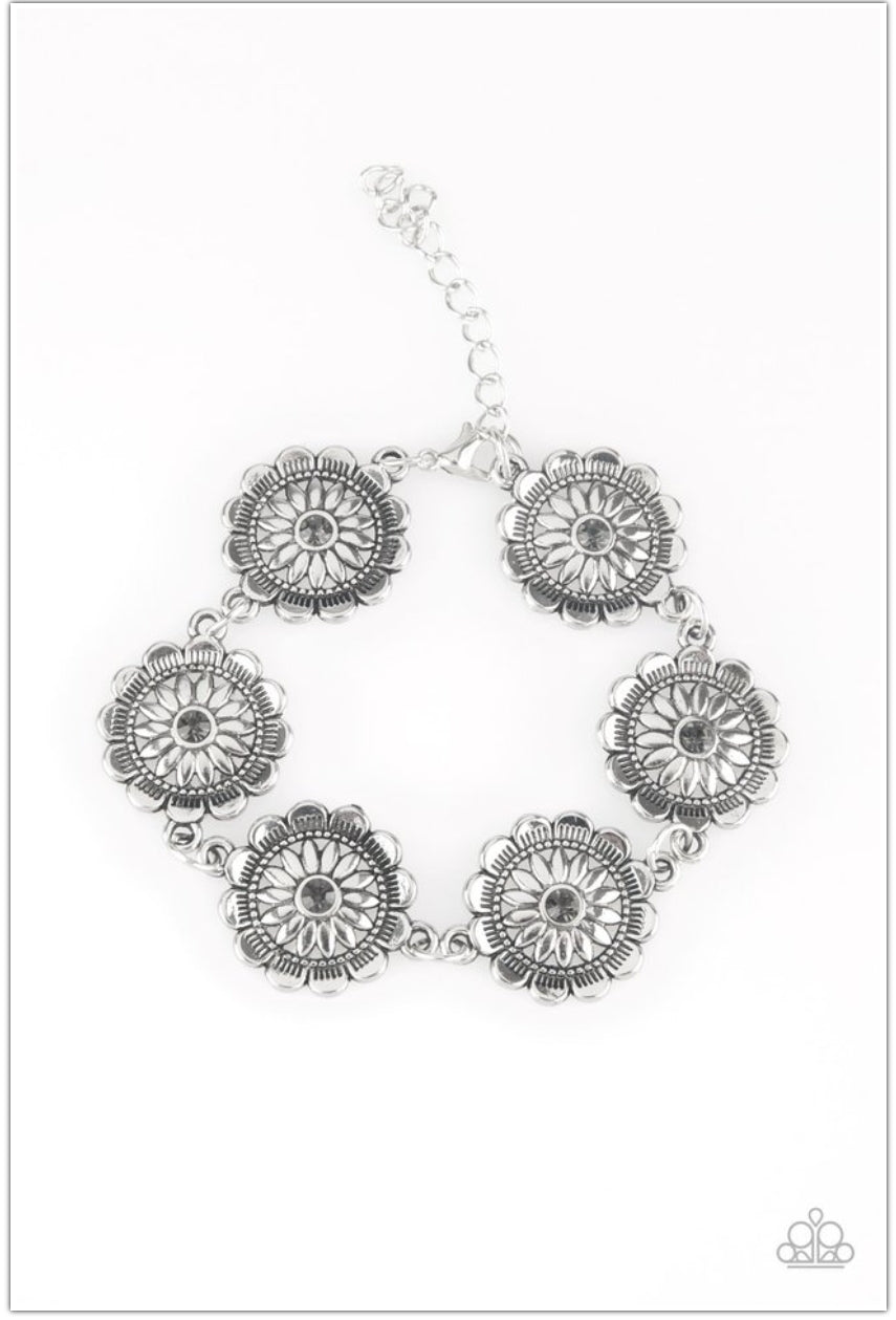 Dotted with smoky rhinestone centers, ornate silver floral frames link across the wrist for a seasonal look. Features an adjustable clasp closure.