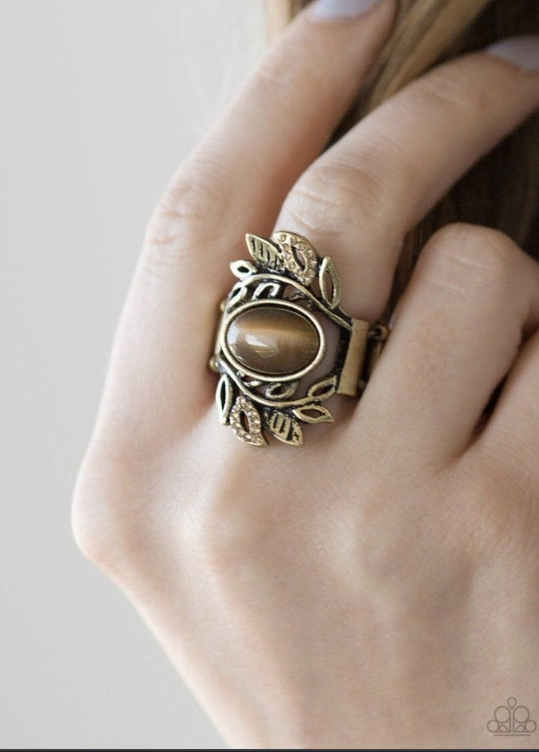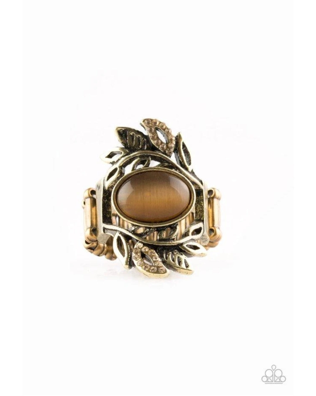 Leafy brass frames curl around a glowing brown moonstone center, creating a whimsical centerpiece. Glassy topaz rhinestones are sprinkled across the leafy frames for a sparkling finish. Features a stretchy band for a flexible fit.