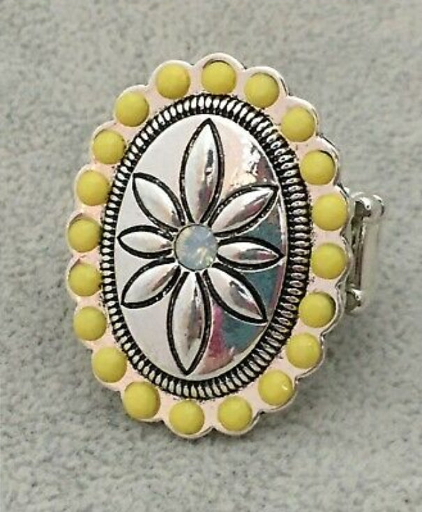 Yellow beads encircle a silver piece, creating a flower design atop the finger. Features a stretchy band for a flexible fit.