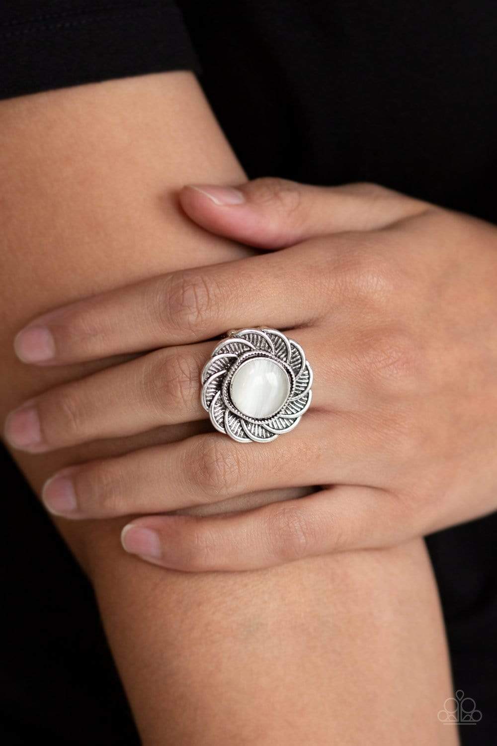 A glowing white moonstone is pressed into the center of a floral frame radiating with textured silver petals for a seasonal look. Features a stretchy band for a flexible fit.
