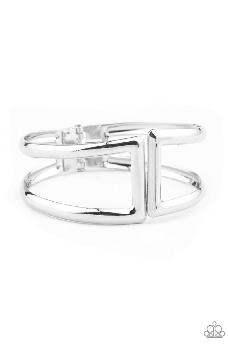 Brushed in a high-sheen shimmer, geometric silver frames curl around the wrist, creating a tribal inspired cuff. Features a hinged closure.