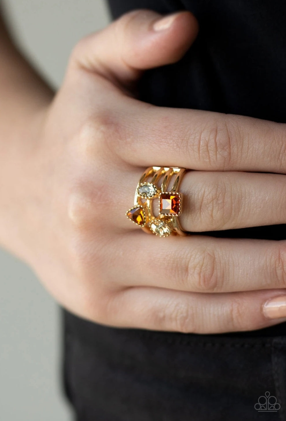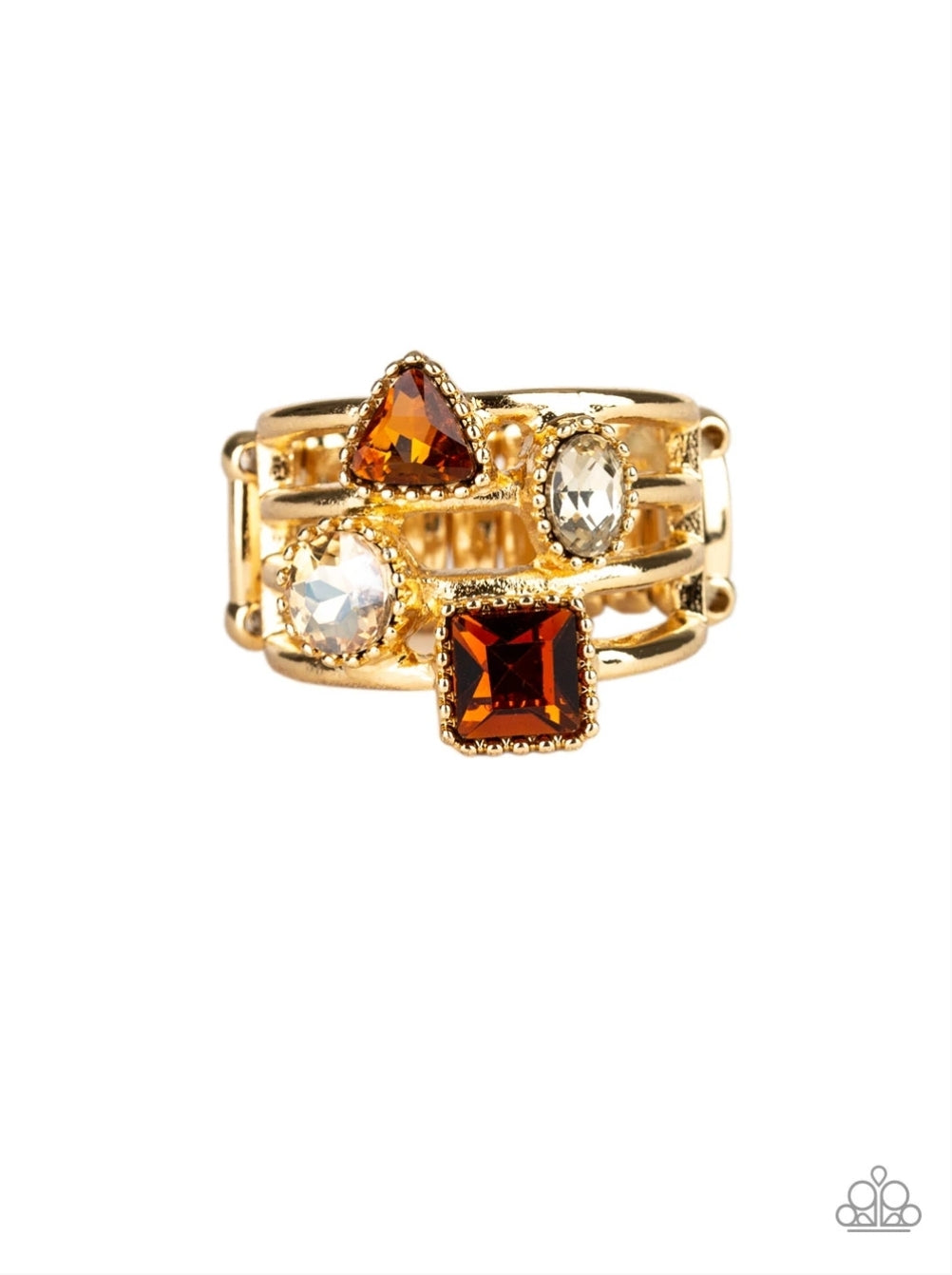 Featuring an array of regal cuts, a collection of glittery topaz and white rhinestones are sprinkled along layered gold bands for a refined look. Features a stretchy band for a flexible fit.