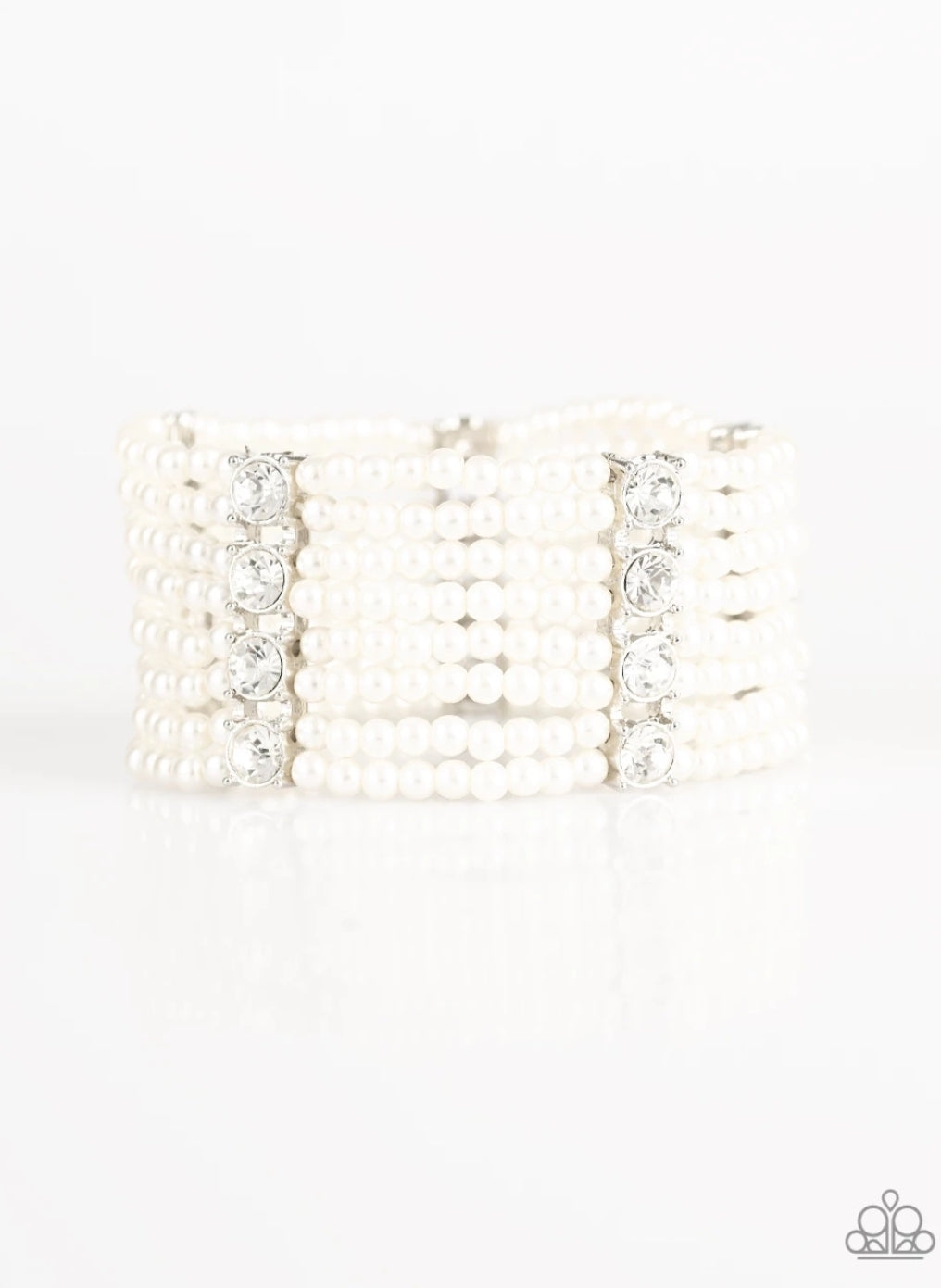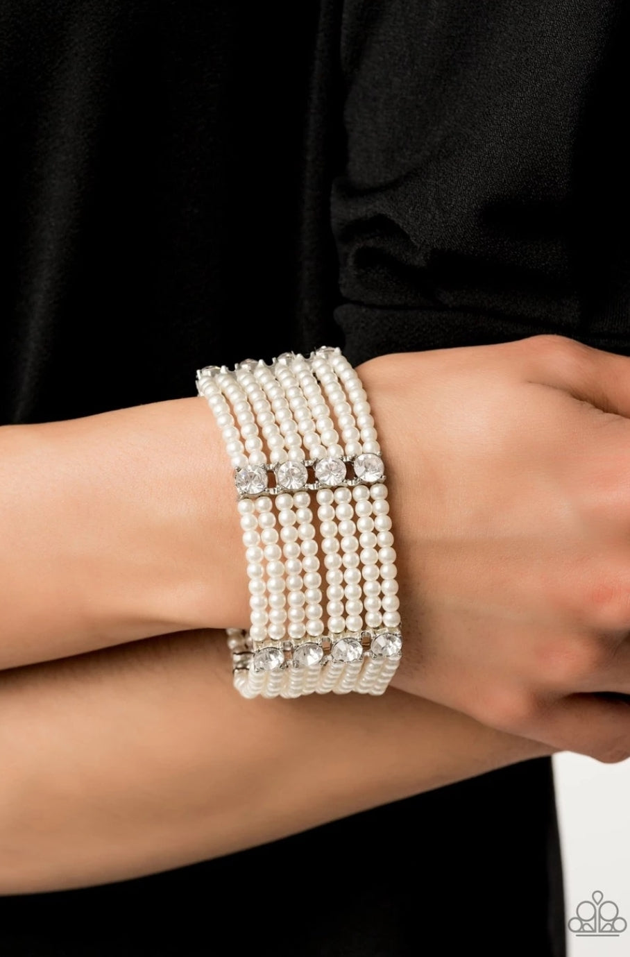 Held together by stacked white rhinestone encrusted frames, a collection of dainty white pearls are threaded along stretchy bands around the wrist for a timeless twist.