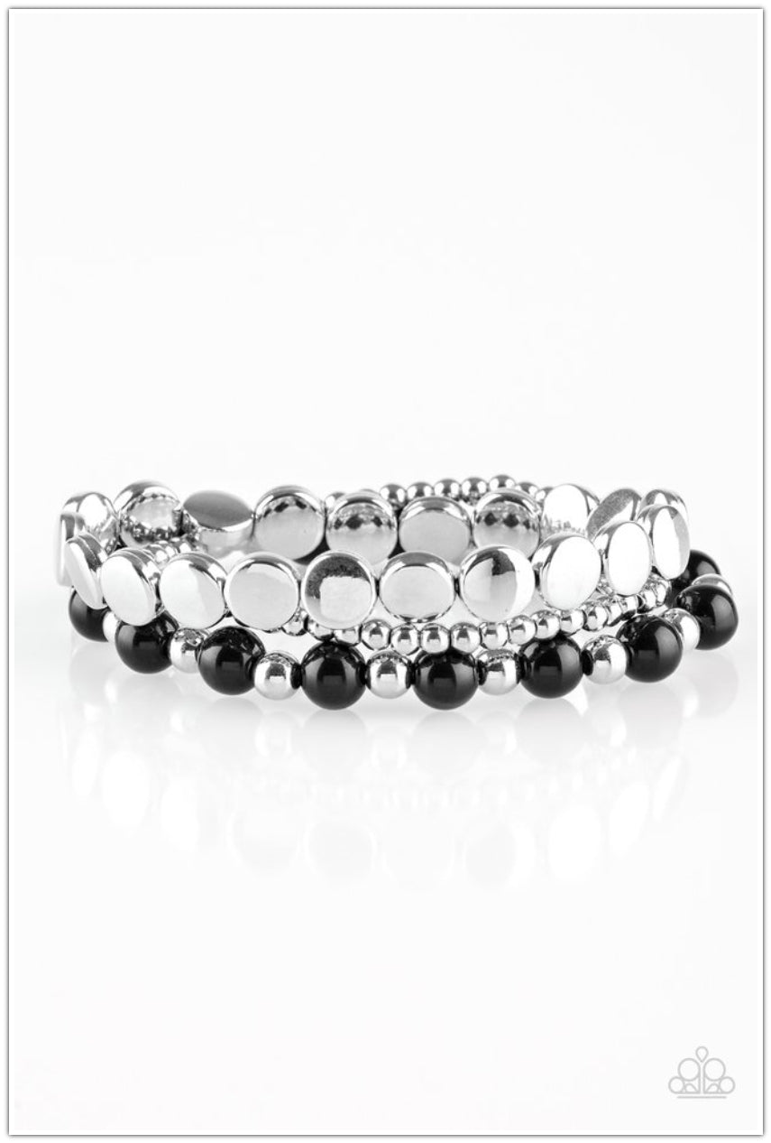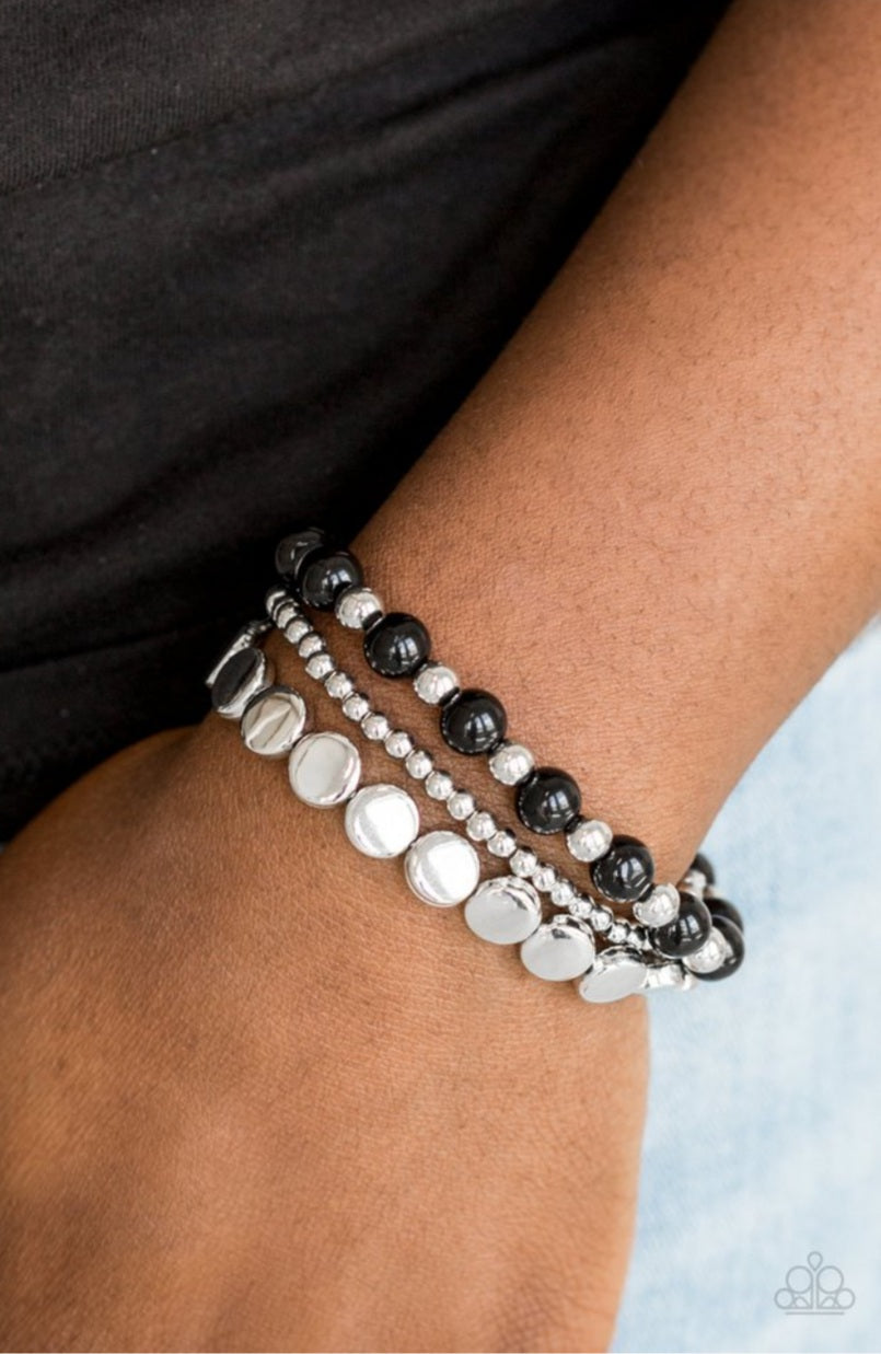 Mismatched silver and shiny black beads are threaded along stretchy elastic bands, creating colorful layers across the wrist.