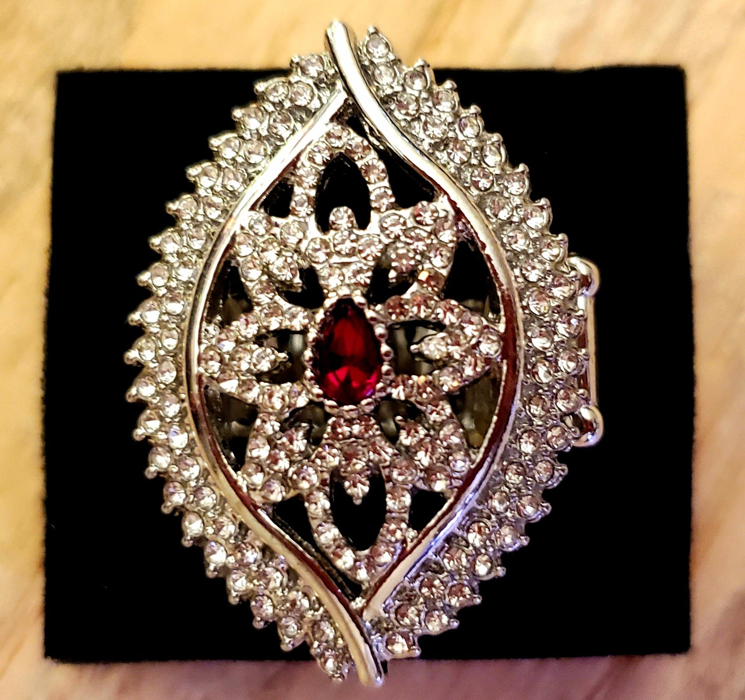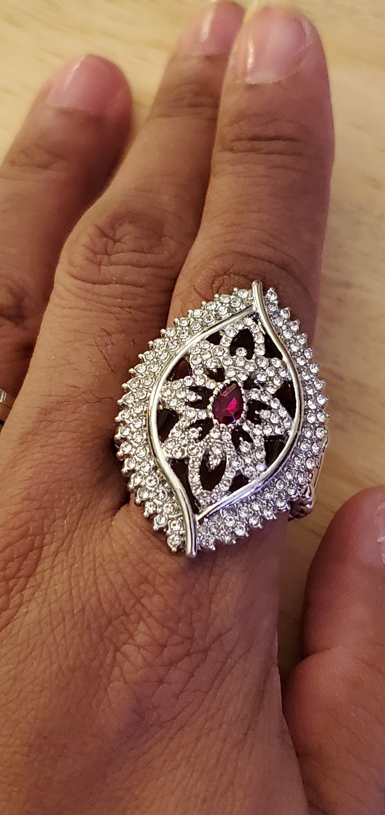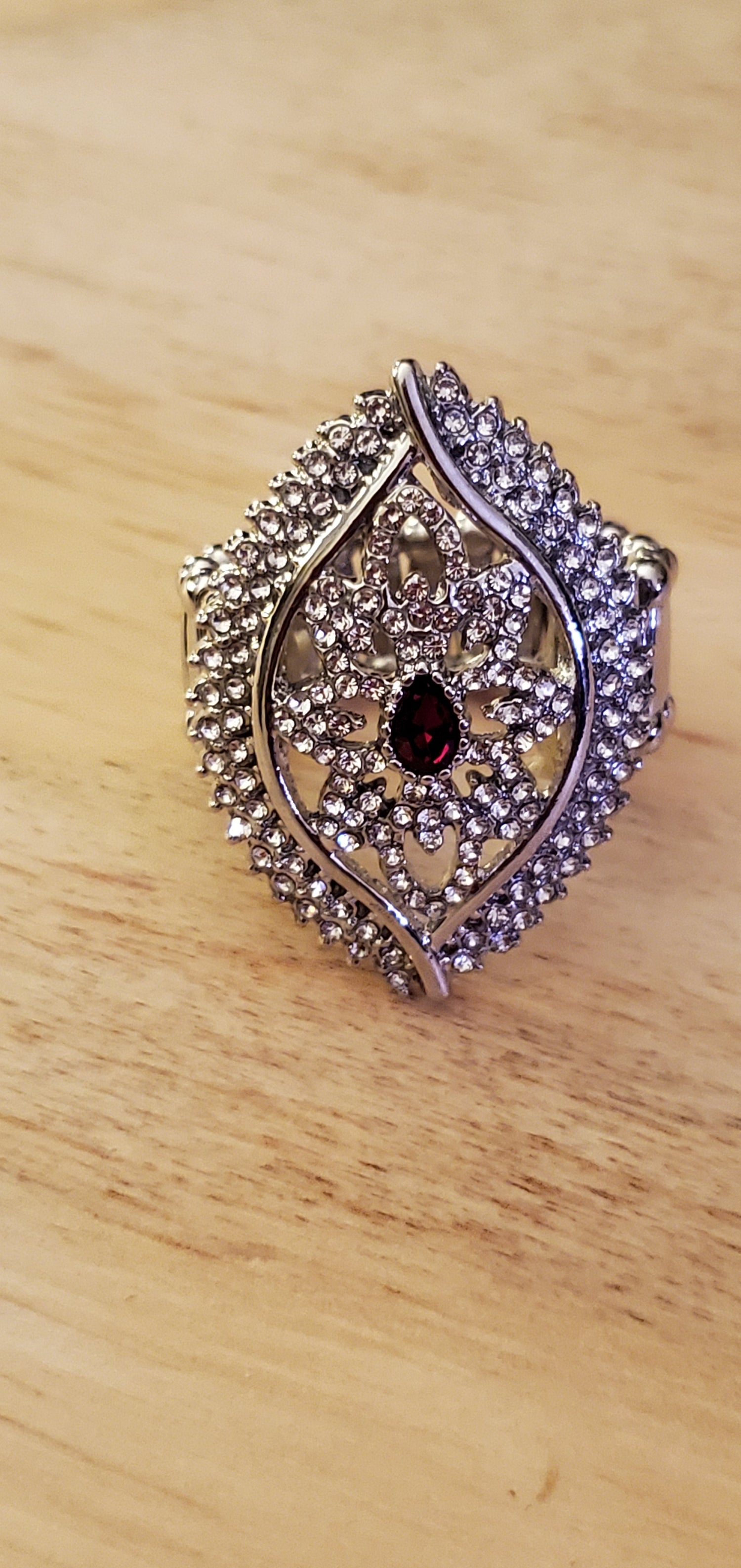 Silver ring with red rhinestone