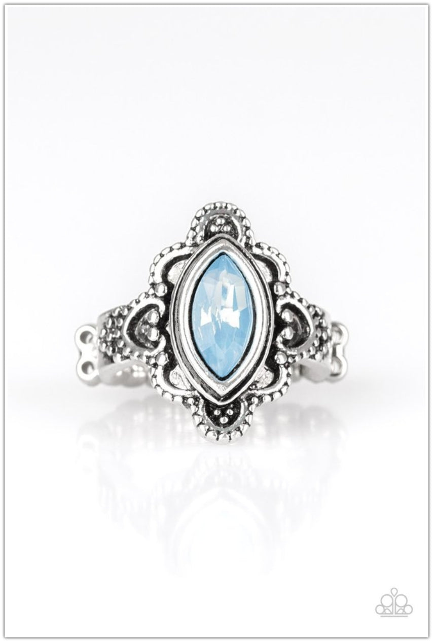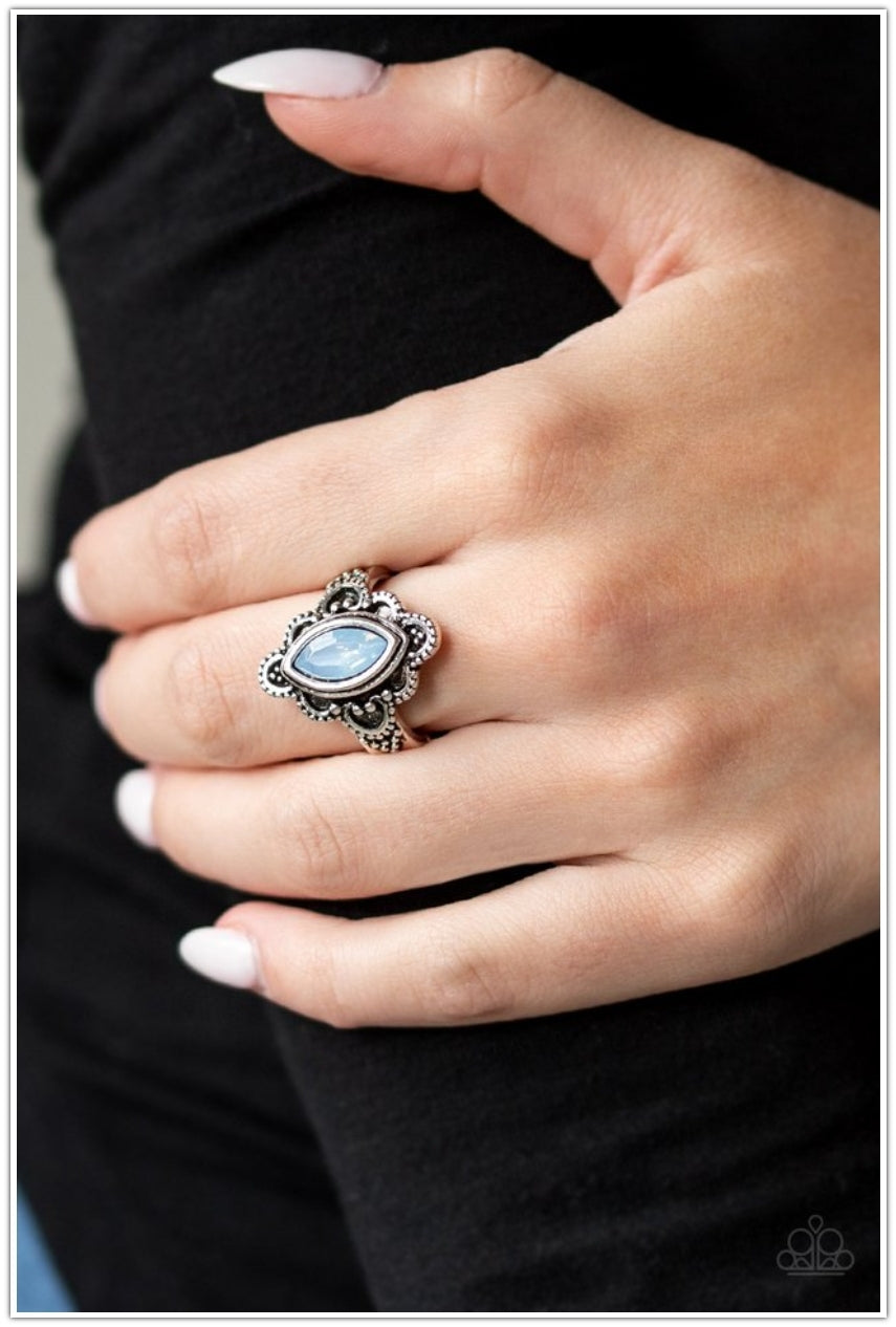 An opalescent blue gem is pressed into a scalloped silver frame radiating with shiny silver studs, creating a whimsical frame atop the finger. Features a dainty stretchy band for a flexible fit.